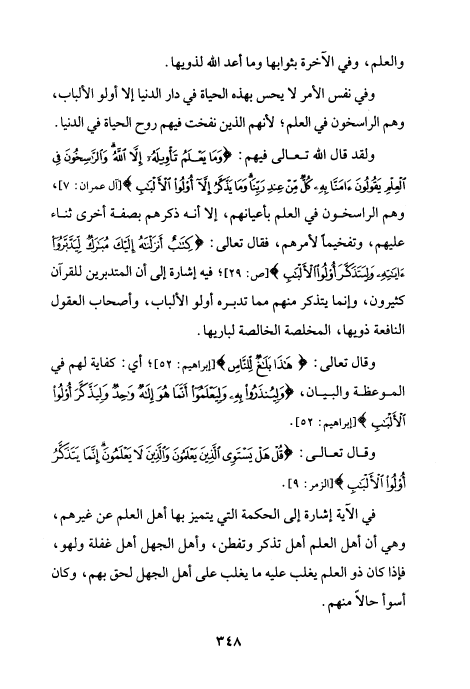 ولقد قال الله تعالى فيهم: {وَمَا يَعْلَمُ تَأْوِيلَهُ إِلَّا اللَّهُ وَالرَّاسِخُونَ فِي الْعِلْمِ يَقُولُونَ آمَنَّا بِهِ كُلٌّ مِنْ عِنْدِ رَبِّنَا وَمَا يَذَّكَّرُ إِلَّا أُولُو الْأَلْبَابِ} [آل عمران: 7]، وهم الراسخون في العلم بأعيانهم، إلا أنه ذكرهم بصفة أخرى ثناء عليهم، وتفخيماً لأمرهم، فقال تعالى: {كِتَابٌ أَنْزَلْنَاهُ إِلَيْكَ مُبَارَكٌ لِيَدَّبَّرُوا آيَاتِهِ وَلِيَتَذَكَّرَ أُولُو الْأَلْبَابِ} [ص: 29]؛ فيه إشارة إلى أن المتدبرين للقرآن كثيرون، وإنما يتذكر منهم مما تدبره أولو الألباب، وأصحاب العقول النافعة ذويها، المخلصة الخالصة لباريها.
