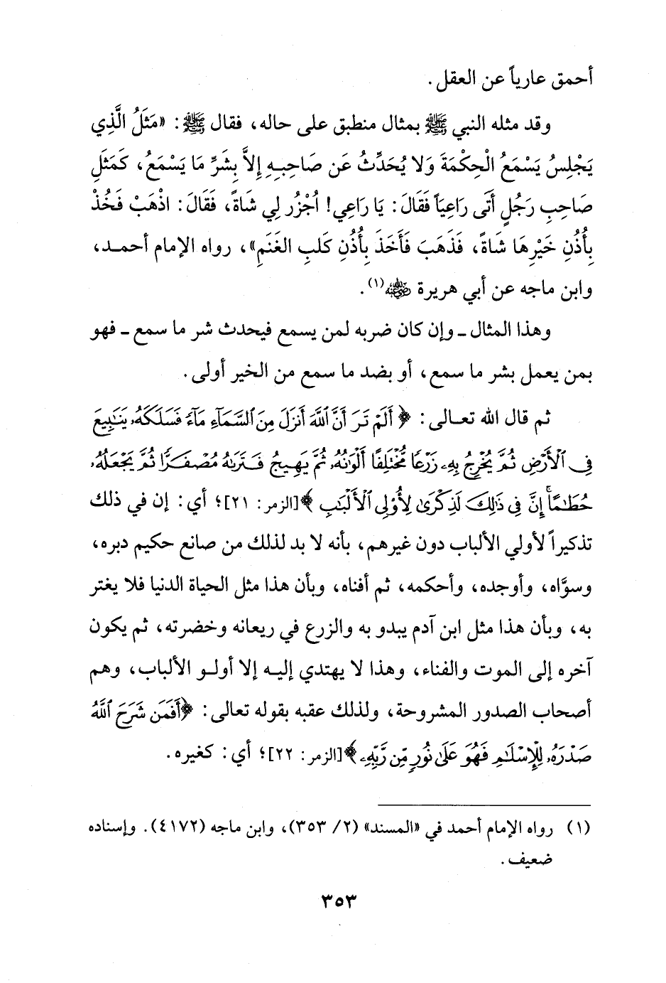 ثم قال الله تعالى: {أَلَمْ تَرَ أَنَّ اللَّهَ أَنْزَلَ مِنَ السَّمَاءِ مَاءً فَسَلَكَهُ يَنَابِيعَ فِي الْأَرْضِ ثُمَّ يُخْرِجُ بِهِ زَرْعًا مُخْتَلِفًا أَلْوَانُهُ ثُمَّ يَهِيجُ فَتَرَاهُ مُصْفَرًّا ثُمَّ يَجْعَلُهُ حُطَامًا إِنَّ فِي ذَلِكَ لَذِكْرَى لِأُولِي الْأَلْبَابِ} [الزمر: 21]؛ أي: إن في ذلك تذكيراً لأولي الألباب دون غيرهم، بأنه لا بد لذلك من صانع حكيم دبره، وسوَّاه، وأوجده، وأحكمه، ثم أفناه، وبأن هذا مثل الحياة الدنيا فلا يغتر به، وبأن هذا مثل ابن آدم يبدو به والزرع في ريعانه وخضرته، ثم يكون آخره إلى الموت والفناء، وهذا لا يهتدي إليه إلا أولو الألباب، وهم أصحاب الصدور المشروحة، ولذلك عقبه بقوله تعالى: {أَفَمَنْ شَرَحَ اللَّهُ صَدْرَهُ لِلْإِسْلَامِ فَهُوَ عَلَى نُورٍ مِنْ رَبِّهِ} [الزمر: 22]؛ أي: كغيره.