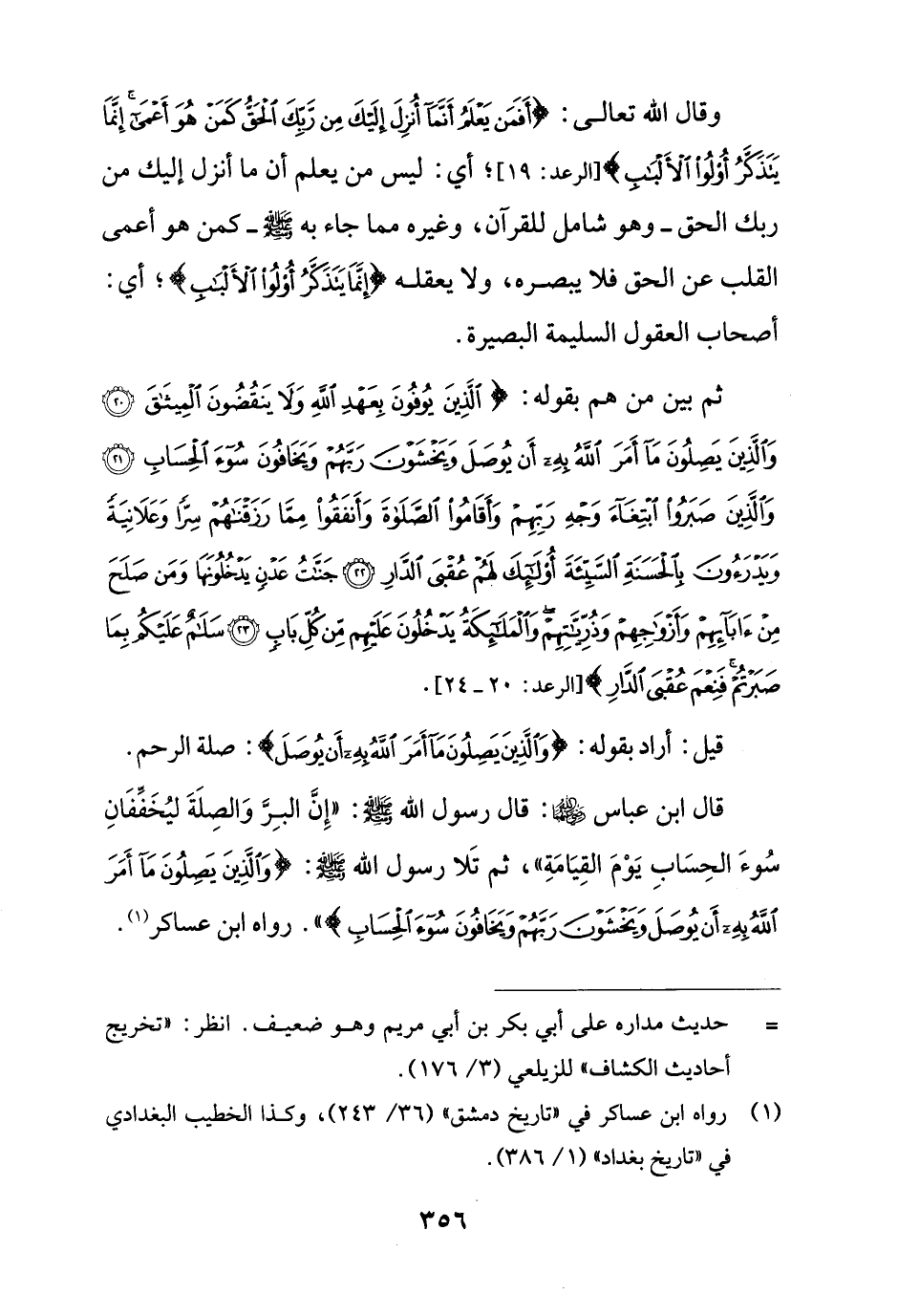 قال ابن عباس - رضي الله عنهما -: قال رسول الله - صلى الله عليه وسلم -: "إِنَّ البِرَّ وَالصِلَةَ ليُخَفّفَانِ سُوءَ الحِسَابِ يَوْمَ القِيَامةَ"، ثم تَلا رسول الله - صلى الله عليه وسلم -: {وَالَّذِينَ يَصِلُونَ مَا أَمَرَ اللَّهُ بِهِ أَنْ يُوصَلَ وَيَخْشَوْنَ رَبَّهُمْ وَيَخَافُونَ سُوءَ الْحِسَابِ} ". رواه ابن عساكر (¬1).