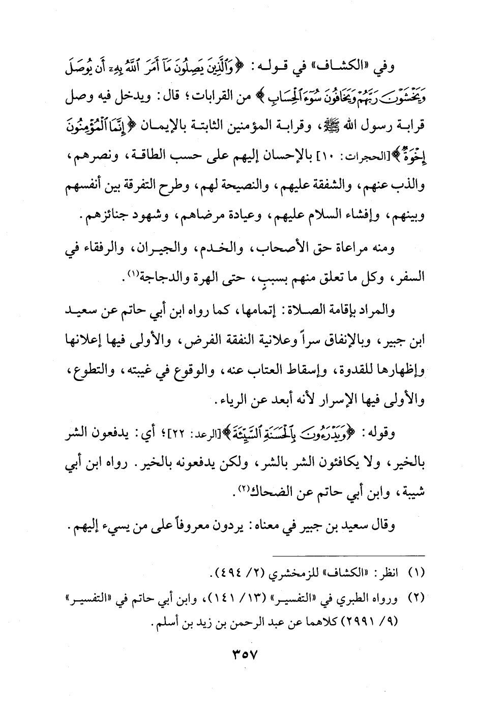 وفي "الكشاف" في قوله: {وَالَّذِينَ يَصِلُونَ مَا أَمَرَ اللَّهُ بِهِ أَنْ يُوصَلَ وَيَخْشَوْنَ رَبَّهُمْ وَيَخَافُونَ سُوءَ الْحِسَابِ} من القرابات؛ قال: ويدخل فيه وصل قرابة رسول الله - صلى الله عليه وسلم -، وقرابة المؤمنين الثابتة بالإيمان {إِنَّمَا الْمُؤْمِنُونَ إِخْوَةٌ} [الحجرات: 10] بالإحسان إليهم على حسب الطاقة، ونصرهم، والذب عنهم، والشفقة عليهم، والنصيحة لهم، وطرح التفرقة بين أنفسهم وبينهم، وإفشاء السلام عليهم، وعيادة مرضاهم، وشهود جنائزهم.