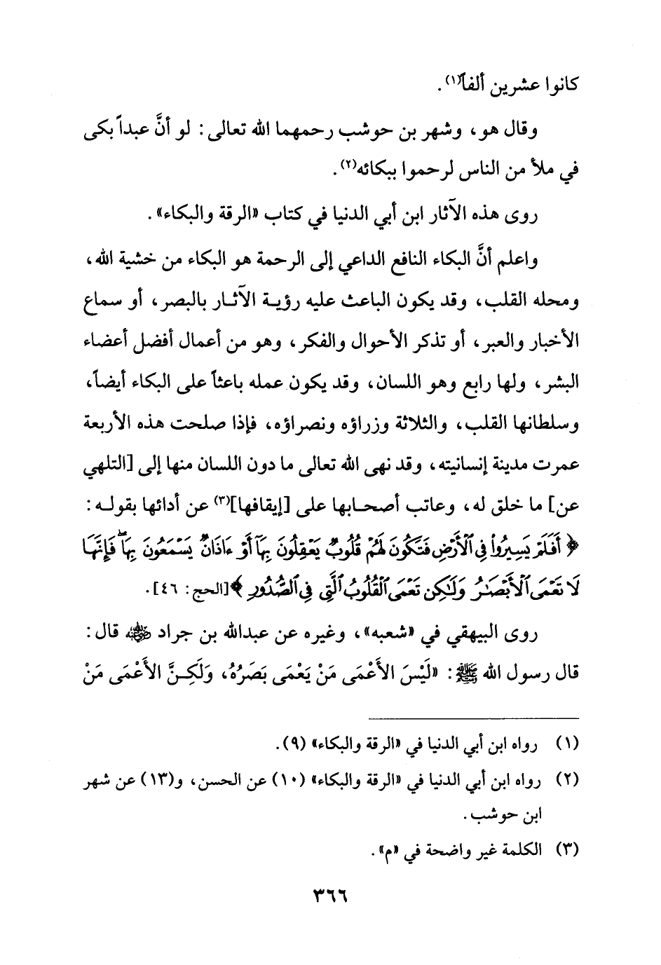 واعلم أنَّ البكاء النافع الداعي إلى الرحمة هو البكاء من خشية الله، ومحله القلب، وقد يكون الباعث عليه رؤية الآثار بالبصر، أو سماع الأخبار والعبر، أو تذكر الأحوال والفكر، وهو من أعمال أفضل أعضاء البشر، ولها رابع وهو اللسان، وقد يكون عمله باعثًا على البكاء أيضًا، وسلطانها القلب، والثلاثة وزراؤه ونصراؤه، فإذا صلحت هذه الأربعة عمرت مدينة إنسانيته، وقد نهى الله تعالى ما دون اللسان منها إلى [التلهي عن] ما خلق له، وعاتب أصحابها على [إيقافها] (¬3) عن أدائها بقوله: {أَفَلَمْ يَسِيرُوا فِي الْأَرْضِ فَتَكُونَ لَهُمْ قُلُوبٌ يَعْقِلُونَ بِهَا أَوْ آذَانٌ يَسْمَعُونَ بِهَا فَإِنَّهَا لَا تَعْمَى الْأَبْصَارُ وَلَكِنْ تَعْمَى الْقُلُوبُ الَّتِي فِي الصُّدُورِ} [الحج: 46].