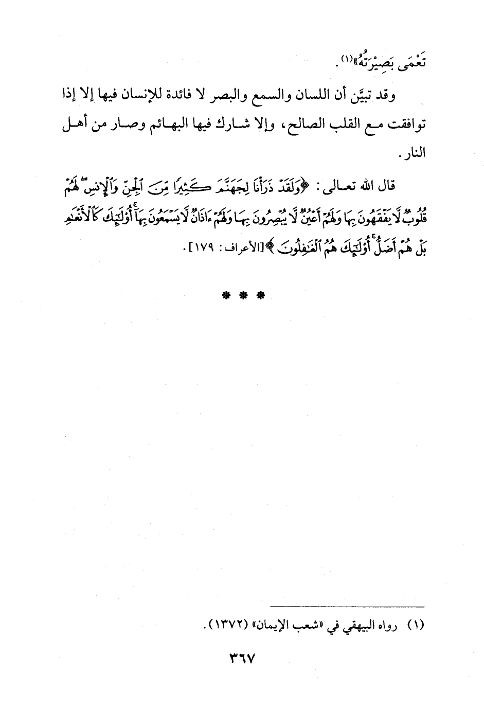 وقد تبيَّن أن اللسان والسمع والبصر لا فائدة للإنسان فيها إلا إذا توافقت مع القلب الصالح، وإلا شارك فيها البهائم وصار من أهل النار.