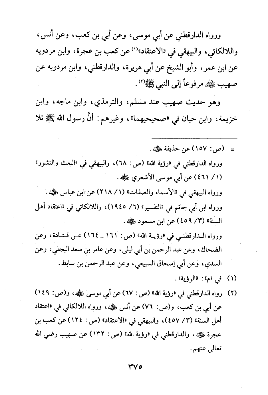 (¬2) رواه الدارقطني في "رؤية الله" (ص: 67) عن أبي موسى - رضي الله عنه -، و (ص: 149) عن أبي بن كعب، و (ص: 76) عن أنس - رضي الله عنه -، ورواه اللالكائي في "اعتقاد أهل السنة" (3/ 457)، والبيهقي في "الاعتقاد" (ص: 124) عن كعب بن عجرة - رضي الله عنه -، والدارقطني في "رؤية الله" (ص: 132) عن صهيب رضي الله تعالى عنهم.