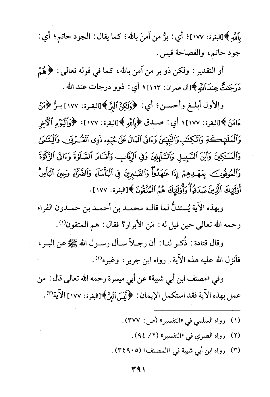 وفي "مصنف ابن أبي شيبة" عن أبي ميسرة رحمه الله تعالى قال: من عمل بهذه الآية فقد استكمل الإيمان: {لَيْسَ الْبِرَّ} [البقرة: 177] الآية (¬3).