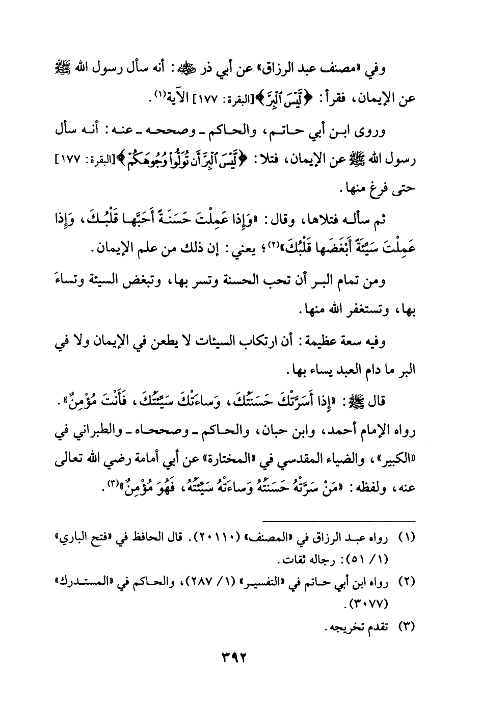 رواه الإِمام أحمد، وابن حبان، والحاكم -وصححاه- والطبراني في "الكبير"، والضياء المقدسي في "المختارة" عن أبي أمامة رضي الله تعالى عنه، ولفظه: "مَنْ سَرتْهُ حَسَنتهُ وَساءَتْهُ سَيئتهُ، فَهُوَ مُؤْمِنٌ" (¬3).