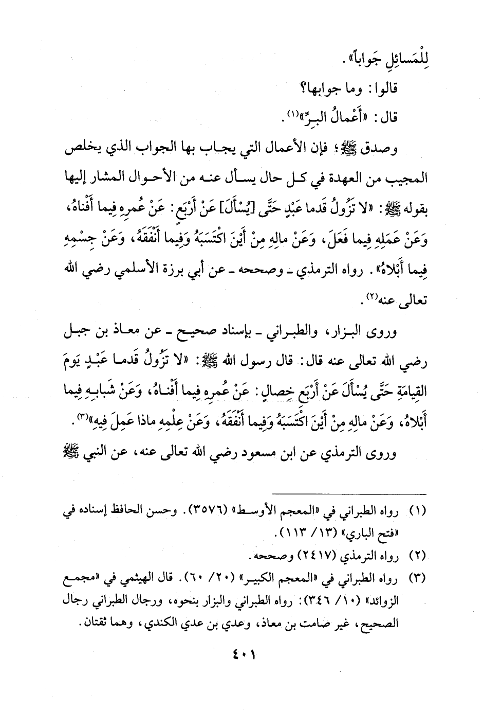 وصدق - صلى الله عليه وسلم -؛ فإن الأعمال التي يجاب بها الجواب الذي يخلص المجيب من العهدة في كل حال يسأل عنه من الأحوال المشار إليها بقوله - صلى الله عليه وسلم -: "لا تَزُولُ قَدما عَبْدٍ حَتَّى [يُسْأَلَ] عَنْ أَرْبَعٍ: عَنْ عُمرِهِ فِيما أَفْناهُ، وَعَنْ عَمَلِهِ فِيما فَعَلَ، وَعَنْ مالِهِ مِنْ أَيْنَ اكْتَسَبَهُ وَفِيما أَنْفَقَهُ، وَعَنْ جِسْمِهِ فِيما أَبْلاهُ". رواه الترمذي -وصححه- عن أبي برزة الأسلمي رضي الله تعالى عنه (¬2).