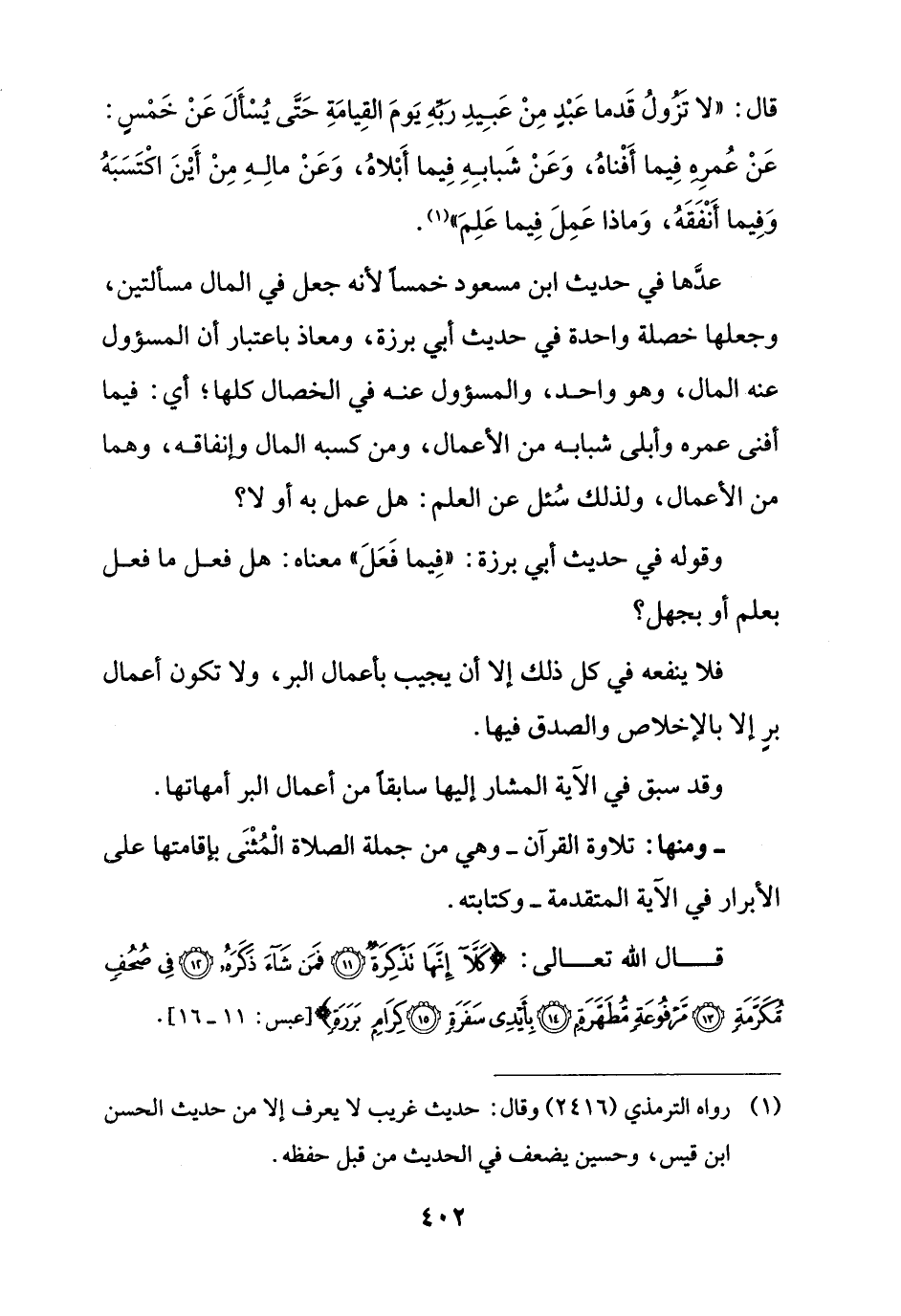 قال: "لا تَزُولُ قَدما عَبْدِ مِنْ عَبِيدِ رِّبهِ يَومَ القِيامَةِ حَتَّى يُسْأَلَ عَنْ خَمْسٍ: عَنْ عُمرِهِ فِيما أفْناهُ، وَعَنْ شَبابِهِ فِيما أَبْلاهُ، وَعَنْ مالِهِ مِنْ أَيْنَ اكْتَسَبَهُ وَفِيما أَنْفَقَهُ، وَماذا عَمِلَ فِيما عَلِمَ" (¬1).