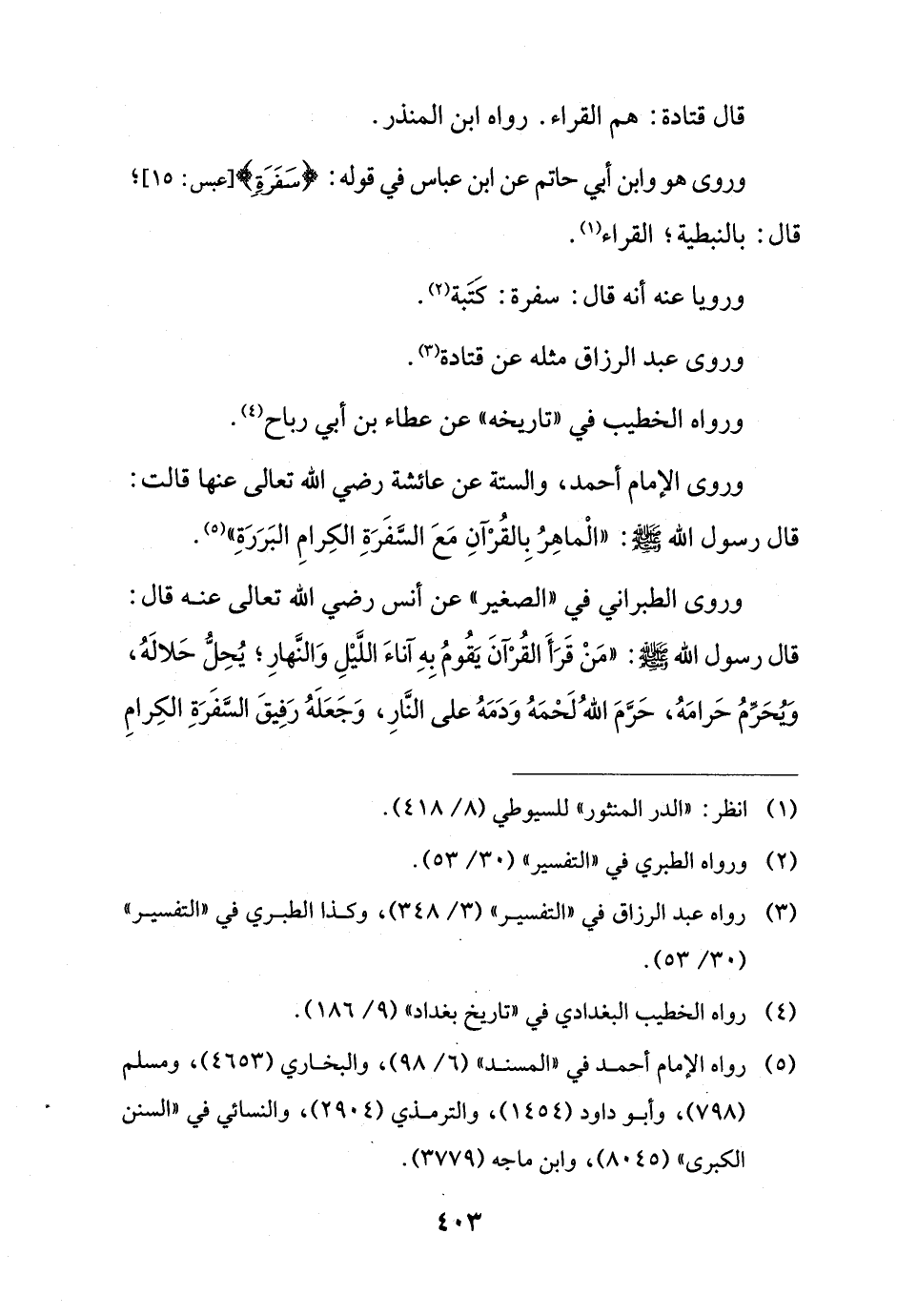 وروى الإِمام أحمد، والستة عن عائشة رضي الله تعالى عنها قالت: قال رسول الله - صلى الله عليه وسلم -: "الْماهِرُ بِالقُرْاَنِ مَعَ السَّفَرَةِ الكِرامِ البَرَرَةِ" (¬5).