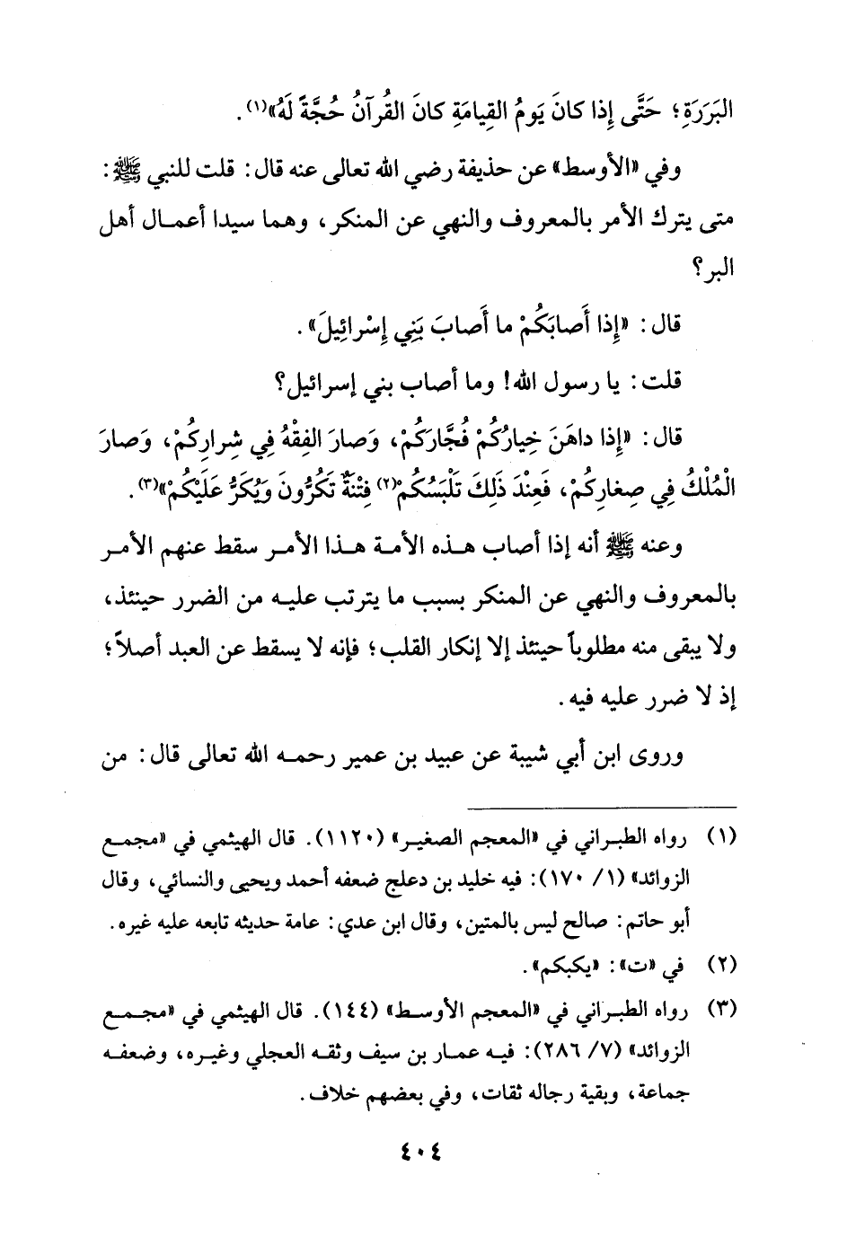 وعنه - صلى الله عليه وسلم - أنه إذا أصاب هذه الأمة هذا الأمر سقط عنهم الأمر بالمعروف والنهي عن المنكر بسبب ما يترتب عليه من الضرر حينئذ، ولا يبقى منه مطلوبًا حينئذ إلا إنكار القلب؛ فإنه لا يسقط عن العبد أصلًا؛ إذ لا ضرر عليه فيه.