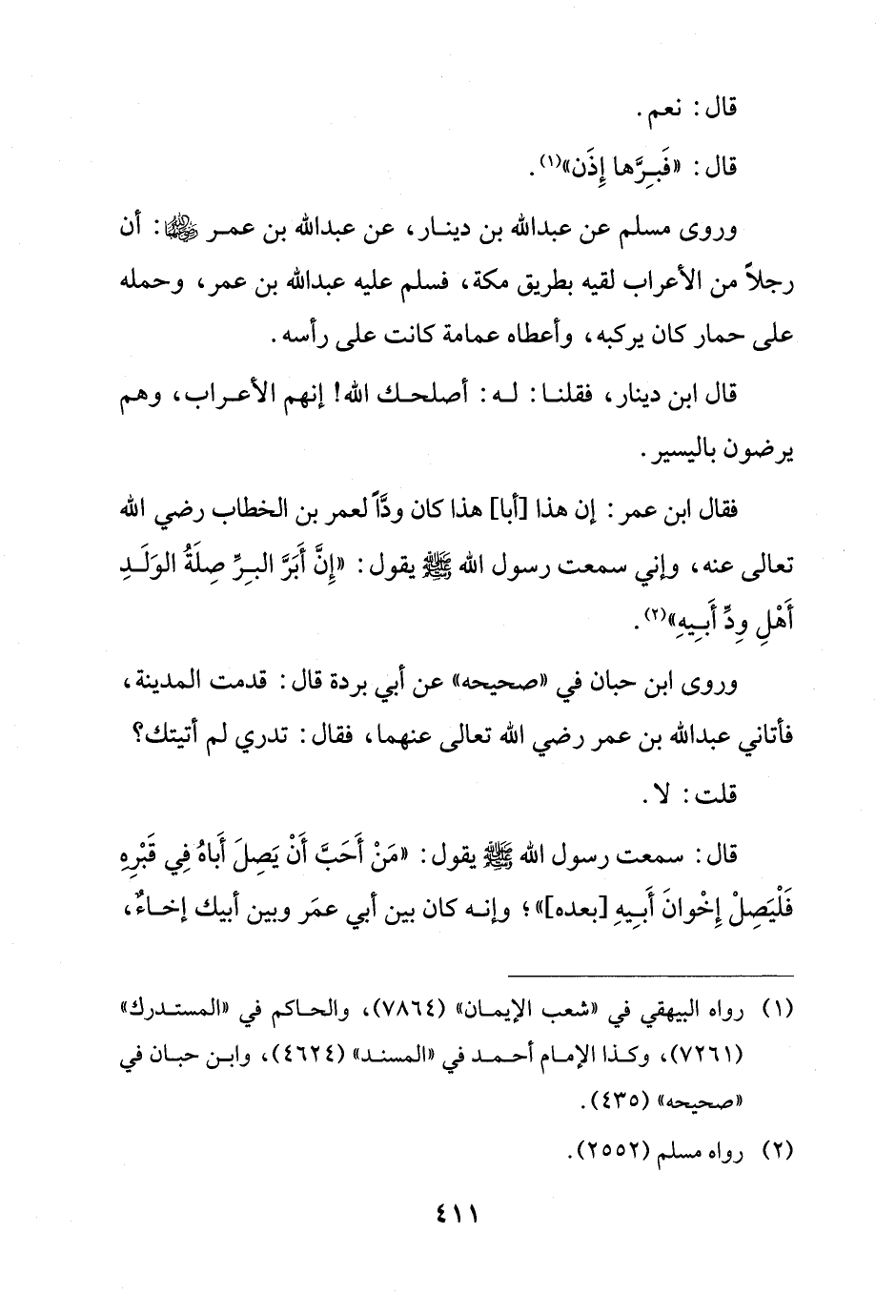 قال: سمعت رسول الله - صلى الله عليه وسلم - يقول: "مَنْ أَحَبَّ أَنْ يَصِلَ أَباهُ في قَبْرِهِ فَلْيَصِلْ إِخْوانَ أَبِيهِ [بعده] "؛ وإنه كان بين أبي عمَر وبين أبيك إخاءٌ،