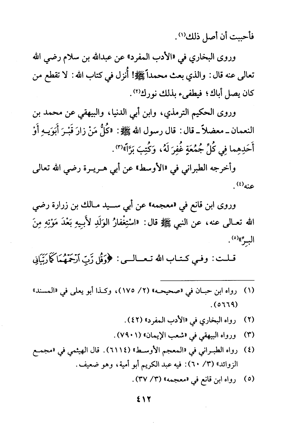 وروى الحكيم الترمذي، وابن أبي الدنيا، والبيهقي عن محمَّد بن النعمان -معضلاً- قال: قال رسول الله - صلى الله عليه وسلم -: "كُل مَنْ زارَ قَبْرَ أَبَوَيهِ أَوْ أَحَدِهِما في كُلِّ جُمُعَةٍ غُفِرَ لَهُ، وَكُتِبَ بَرًّا" (¬3).
