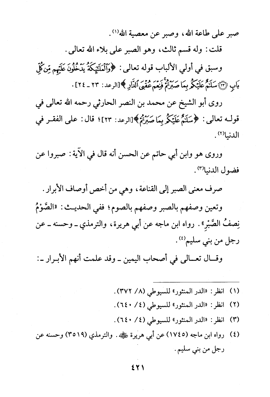 روى أبو الشيخ عن محمَّد بن النصر الحارثي رحمه الله تعالى في قوله تعالى: {سَلَامٌ عَلَيْكُمْ بِمَا صَبَرْتُمْ} [الرعد: 24]، قال: على الفقر في الدنيا (¬2).