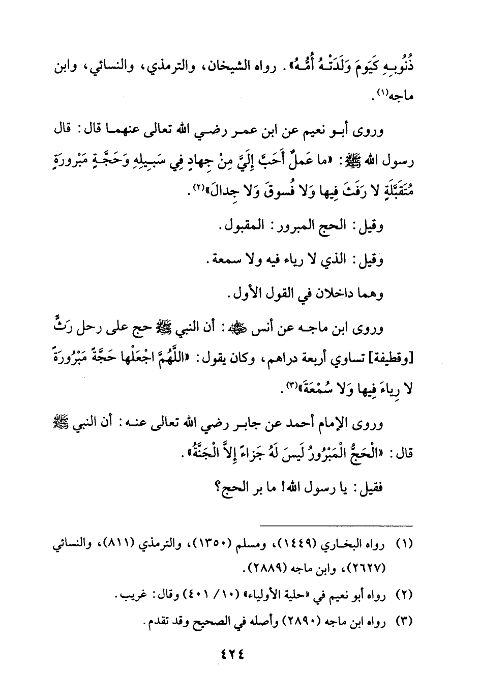وروى أبو نعيم عن ابن عمر رضي الله تعالى عنهما قال: قال رسول الله - صلى الله عليه وسلم -: "ما عَمل أَحَبَّ إِلَيَ مِنْ جِهادٍ في سَبِيلِهِ وَحَجَّةٍ مَبْرورَةٍ مُتَقَبَّلَةٍ لا رَفَثَ فِيها وَلا فُسوقَ وَلا جِدالَ" (¬2).