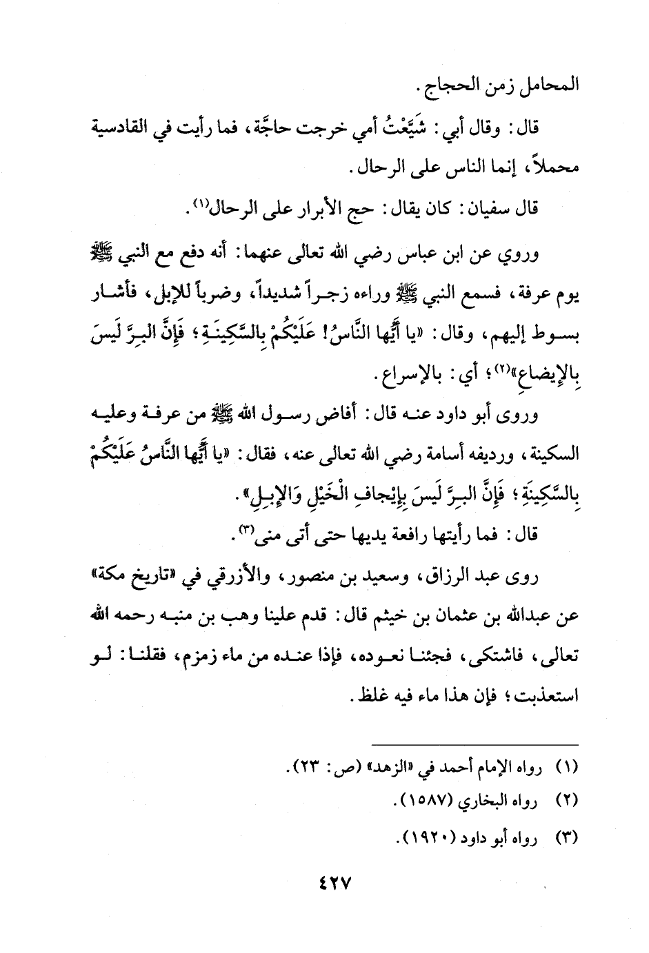 وروى أبو داود عنه قال: أفاض رسول الله - صلى الله عليه وسلم - من عرفة وعليه السكينة، ورديفه أسامة رضي الله تعالى عنه، فقال: "يَا أيُّها النَّاس عَلَيكُم بِالسَّكِينَةِ؛ فَإِنَّ البِرَّ لَيسَ بِإِيْجافِ الخَيْلِ وَالإِبِلِ".