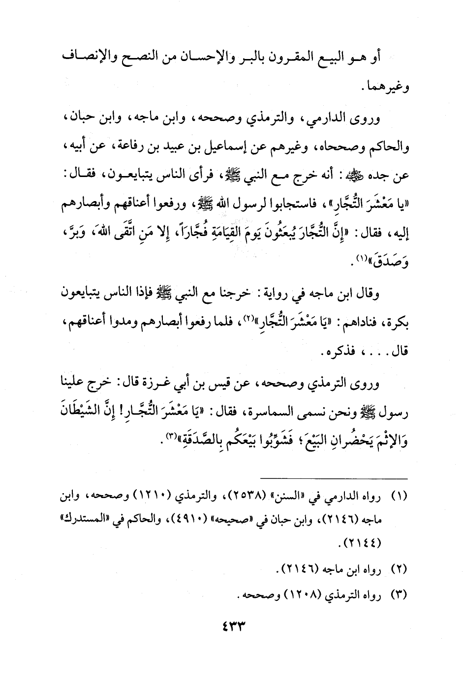 وروى الدارمي، والترمذي وصححه، وابن ماجه، وابن حبان، والحاكم وصححاه، وغيرهم عن إسماعيل بن عبيد بن رفاعة، عن أبيه، عن جده - رضي الله عنه -: أنه خرج مع النبي - صلى الله عليه وسلم -، فرأى الناس يتبايعون، فقال: "يا مَعْشَرَ التُّجَّارِ"، فاستجابوا لرسول الله - صلى الله عليه وسلم -، ورفعوا أعناقهم وأبصارهم إليه، فقال: "إِنَّ التُجَّارَ يُبعَثُونَ يَومَ القِيَامَةِ فُجَّارًا، إِلَّا مَنِ اتَّقَى الله، وَبرَّ، وَصَدَقَ" (¬1).
