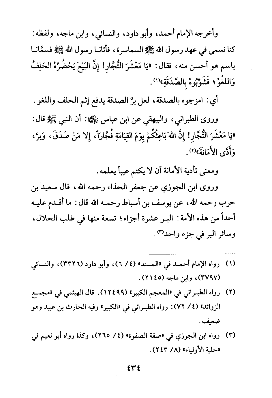 وأخرجه الإِمام أحمد، وأبو داود، والنسائي، وابن ماجه، ولفظه: كنا نسمى في عهد رسول الله - صلى الله عليه وسلم - السماسرة، فأتانا رسول الله في - صلى الله عليه وسلم - فسمَّانا باسم هو أحسن منه، فقال: "يَا مَعْشَرَ التُجَّارِ! إِنَّ البَيع يَحْضُرُهُ الحَلِفُ وَاللغْوُ؛ فَشَوبُوهُ بِالصَّدَقَةِ" (¬1).