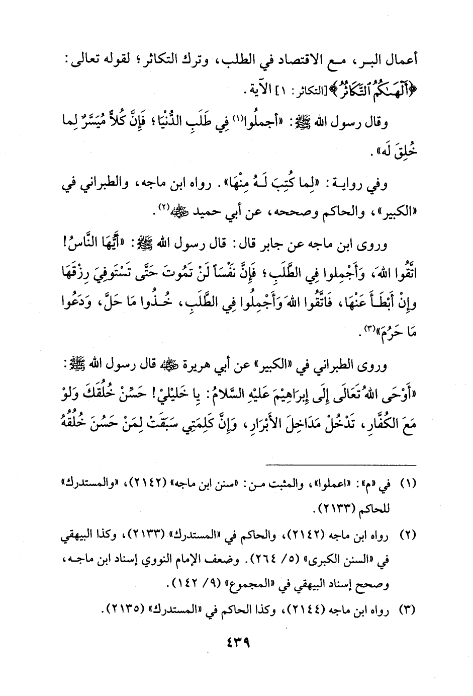أعمال البر، مع الاقتصاد في الطلب، وترك التكاثر؛ لقوله تعالى: {أَلْهَاكُمُ التَّكَاثُرُ} [التكاثر: 1] الآية.