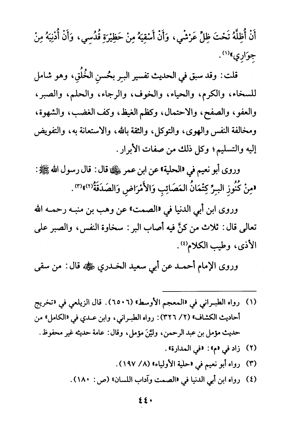 وروى ابن أبي الدنيا في "الصمت" عن وهب بن منبه رحمه الله تعالى قال: ثلاث من كنَّ فيه أصاب البر: سخاوة النفس، والصبر على الأذى، وطيب الكلام (¬4).