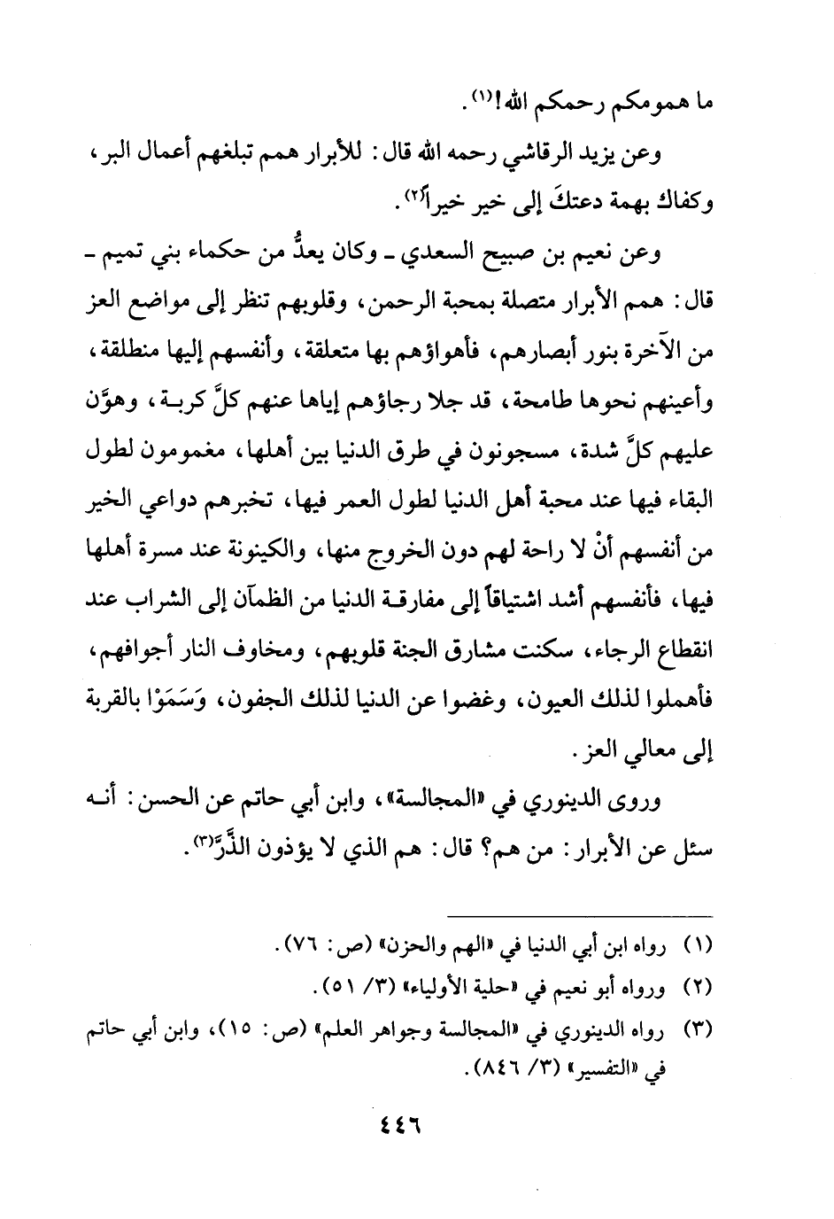 وروى الدينوري في "المجالسة"، وابن أبي حاتم عن الحسن: أنه سئل عن الأبرار: من هم؟ قال: هم الذي لا يؤذون الذَّرَّ (¬3).