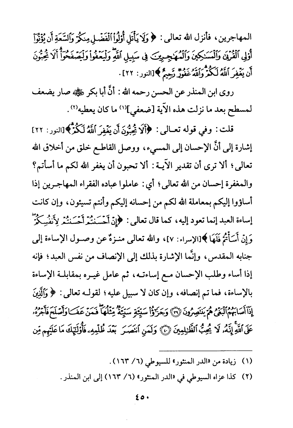 قلت: وفي قوله تعالى: {أَلَا تُحِبُّونَ أَنْ يَغْفِرَ اللَّهُ لَكُمْ} [النور: 22] إشارة إلى أنَّ الإحسان إلى المسيء، ووصل القاطع خلق من أخلاق الله تعالى؛ ألا ترى أن تقدير الآية: ألا تحبون أن يغفر الله لكم ما أسأتم؟ والمغفرة إحسان من الله تعالى؛ أي: عاملوا عباده الفقراء المهاجرين إذا أساؤوا إليكم بمعاملة الله لكم من إحسانه إليكم وأنتم تسيئون، وإن كانت إساءة العبد إنما تعود إليه، كما قال تعالى: {إِنْ أَحْسَنْتُمْ أَحْسَنْتُمْ لِأَنْفُسِكُمْ وَإِنْ أَسَأْتُمْ فَلَهَا} [الإسراء: 7]، والله تعالى منزهٌ عن وصول الإساءة إلى جنابه المقدس، وإنما الإشارة بذلك إلى الإنصاف من نفس العبد؛ فإنه إذا أساء وطلب الإحسان مع إساءته، ثم عامل غيره بمقابلة الإساءة بالإساءة، فما تم إنصافه، وإن كان لا سبيل عليه؛ لقوله تعالى: {وَالَّذِينَ إِذَا أَصَابَهُمُ الْبَغْيُ هُمْ يَنْتَصِرُونَ (39) وَجَزَاءُ سَيِّئَةٍ سَيِّئَةٌ مِثْلُهَا فَمَنْ عَفَا وَأَصْلَحَ فَأَجْرُهُ عَلَى اللَّهِ إِنَّهُ لَا يُحِبُّ الظَّالِمِينَ (40) وَلَمَنِ انْتَصَرَ بَعْدَ ظُلْمِهِ فَأُولَئِكَ مَا عَلَيْهِمْ مِنْ
