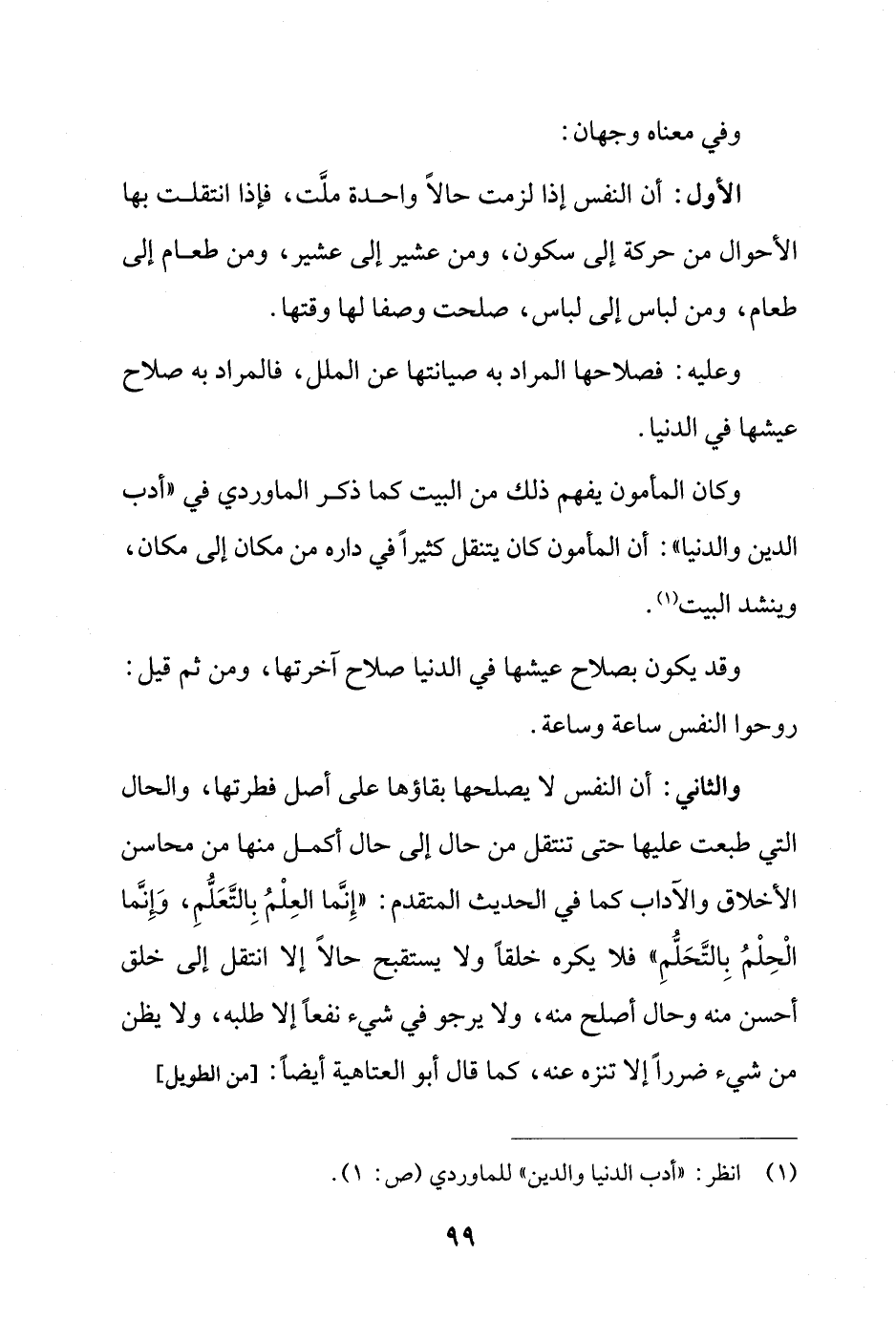 والثاني: أن النفس لا يصلحها بقاؤها على أصل فطرتها، والحال التي طبعت عليها حتى تنتقل من حال إلى حال أكمل منها من محاسن الأخلاق والآداب كما في الحديث المتقدم: "إِنَّما العِلْمُ بِالتَّعَلُمِ، وإِنَّما الْحِلْمُ بِالتَّحَلُّمِ" فلا يكره خلقاً ولا يستقبح حالاً إلا انتقل إلى خلق أحسن منه وحال أصلح منه، ولا يرجو في شيء نفعاً إلا طلبه، ولا يظن من شيء ضرراً إلا تنزه عنه، كما قال أبو العتاهية أيضاً: [من الطويل]