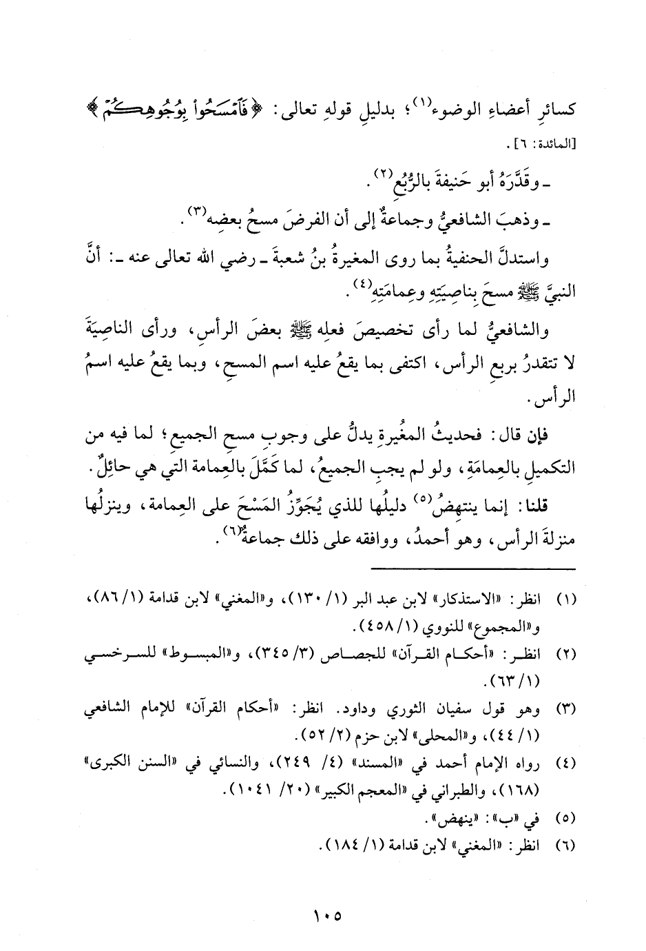 واستدلَّ الحنفيةُ بما روى المغيرةُ بنُ شعبةَ -رضي الله تعالى عنه-: أنَّ النبيَّ - صلى الله عليه وسلم - مسحَ بِناصِيَتِهِ وعِمامَتِهِ (¬4).