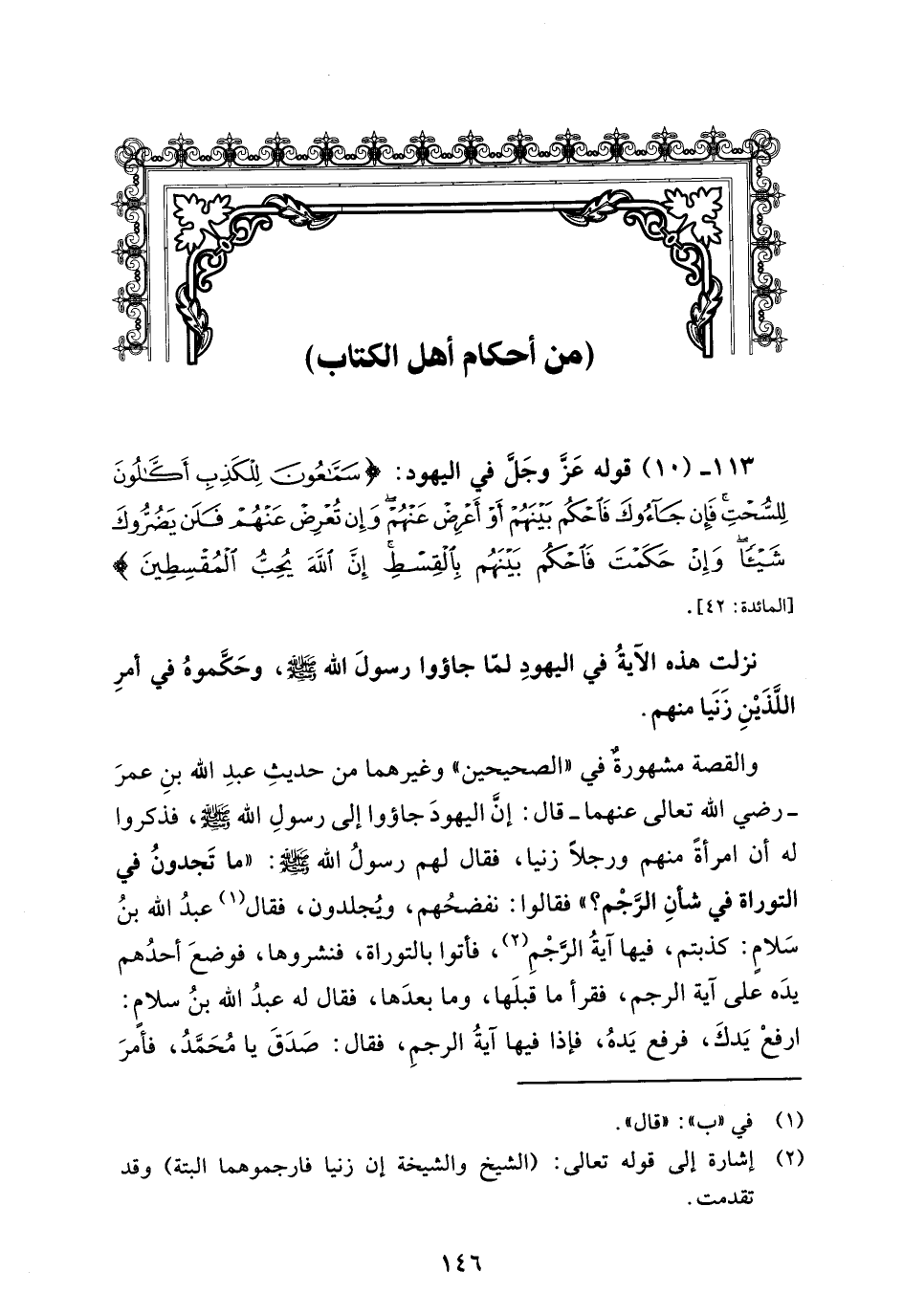 113 - (10) قوله عَزَّ وجَلَّ في اليهود {سَمَّاعُونَ لِلْكَذِبِ أَكَّالُونَ لِلسُّحْتِ فَإِنْ جَاءُوكَ فَاحْكُمْ بَيْنَهُمْ أَوْ أَعْرِضْ عَنْهُمْ وَإِنْ تُعْرِضْ عَنْهُمْ فَلَنْ يَضُرُّوكَ شَيْئًا وَإِنْ حَكَمْتَ فَاحْكُمْ بَيْنَهُمْ بِالْقِسْطِ إِنَّ اللَّهَ يُحِبُّ الْمُقْسِطِينَ} [المائدة: 42].