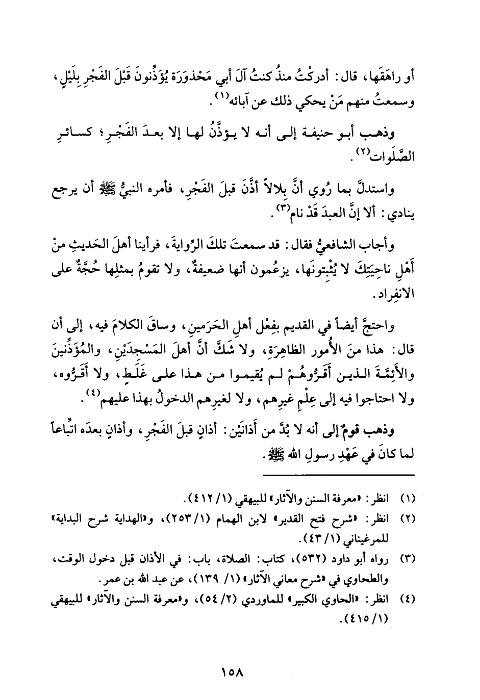 واحتجَّ أيضاً في القديم بفِعْل أهلِ الحَرَمينِ، وساقَ الكلامَ فيه، إلى أن قال: هذا منَ الأُمور الظاهِرَةِ، ولا شَكَّ أنَّ أهلَ المَسْجِدَيْنِ، والمُؤَذِّنينَ والأَئِمَّةَ الذين أَقَرُّوهُمْ لم يُقيموا من هذا على غَلَطٍ، ولا أَقَرُّوه، ولا احتاجوا فيه إلى عِلْمِ غيرِهم، ولا لغيرِهم الدخولُ بهذا عليهم (¬4).