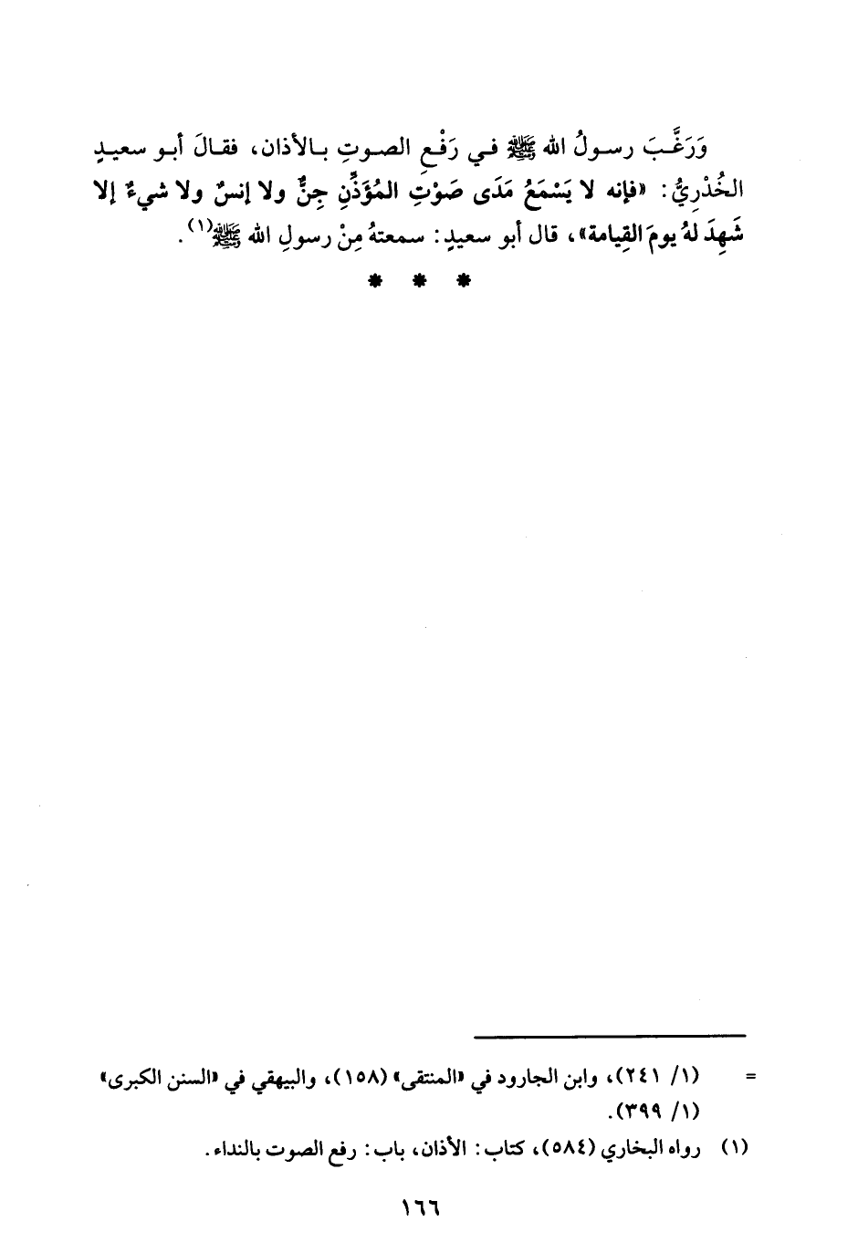 وَرَغَّبَ رسولُ الله - صلى الله عليه وسلم - في رَفْعِ الصوتِ بالأذان، فقالَ أبو سعيدٍ الخُدْرِيُّ: "فإنه لا يَسْمَعُ مَدَى صَوْتِ المُؤَذِّنِ جِنٌّ ولا إنسٌ ولا شيءٌ إلا شَهِدَ لهُ يومَ القِيامة"، قال أبو سعيدٍ: سمعتهُ مِنْ رسولِ الله - صلى الله عليه وسلم - (¬1).