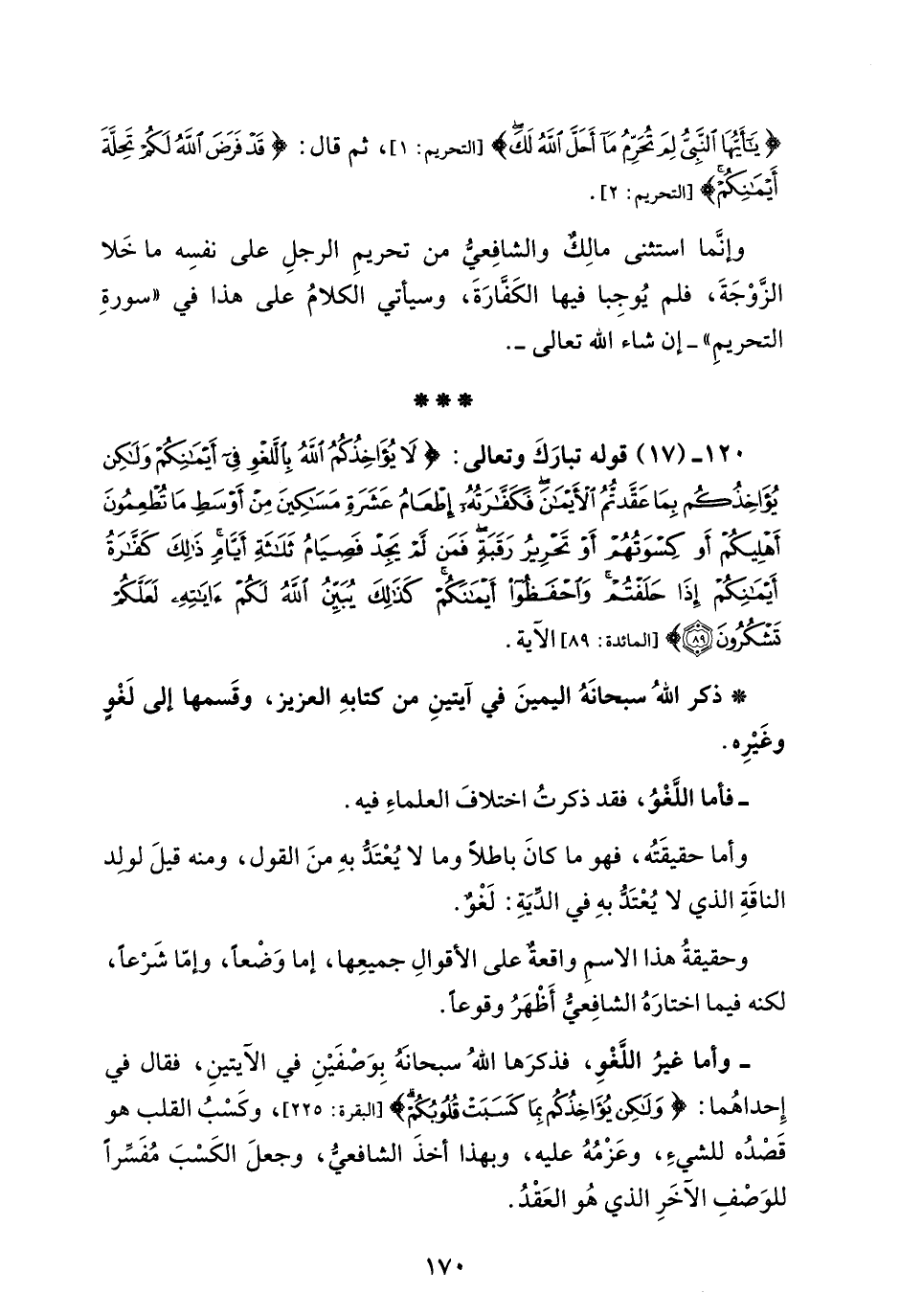 120 - (17) قوله تبارَكَ وتعالى: {لَا يُؤَاخِذُكُمُ اللَّهُ بِاللَّغْوِ فِي أَيْمَانِكُمْ وَلَكِنْ يُؤَاخِذُكُمْ بِمَا عَقَّدْتُمُ الْأَيْمَانَ فَكَفَّارَتُهُ إِطْعَامُ عَشَرَةِ مَسَاكِينَ مِنْ أَوْسَطِ مَا تُطْعِمُونَ أَهْلِيكُمْ أَوْ كِسْوَتُهُمْ أَوْ تَحْرِيرُ رَقَبَةٍ فَمَنْ لَمْ يَجِدْ فَصِيَامُ ثَلَاثَةِ أَيَّامٍ ذَلِكَ كَفَّارَةُ أَيْمَانِكُمْ إِذَا حَلَفْتُمْ وَاحْفَظُوا أَيْمَانَكُمْ كَذَلِكَ يُبَيِّنُ اللَّهُ لَكُمْ آيَاتِهِ لَعَلَّكُمْ تَشْكُرُونَ} [المائدة: 89] الآية.