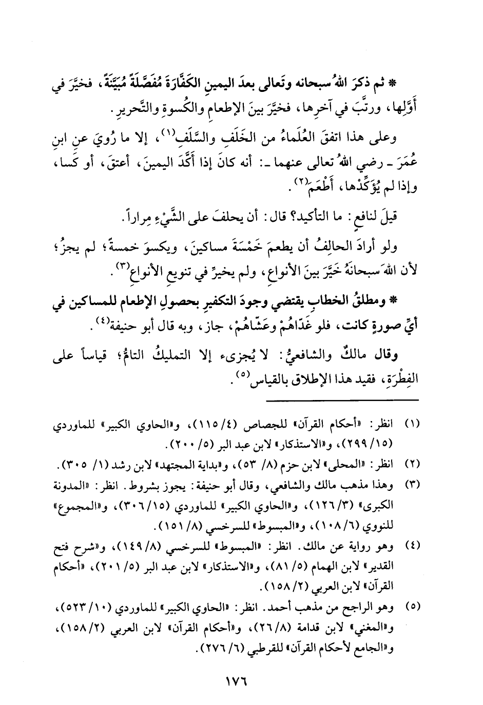 * ثم ذكرَ اللهُ سبحانه وتَعالى بعدَ اليمينِ الكَفارَةَ مُفَضَلَةً مُبَيَّنَةً، فخيَّرَ في أَوَّلِها، ورتَّبَ في آخرِها، فخيَّرَ بينَ الإطعامِ والكُسوةِ والتَّحريرِ.