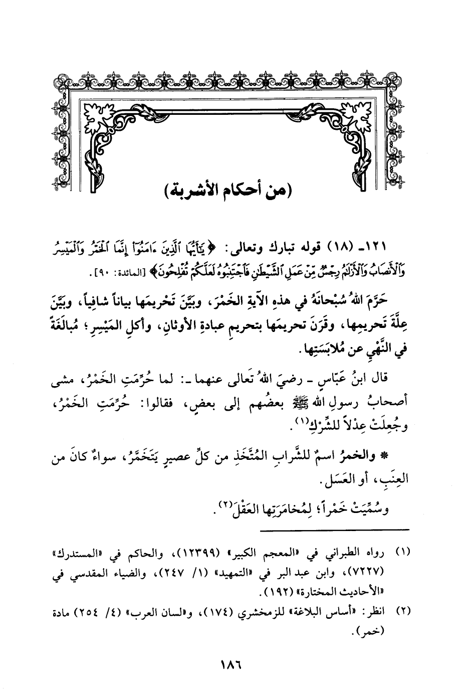 121 - (18) قوله تبارك وتعالى: {يَاأَيُّهَا الَّذِينَ آمَنُوا إِنَّمَا الْخَمْرُ وَالْمَيْسِرُ وَالْأَنْصَابُ وَالْأَزْلَامُ رِجْسٌ مِنْ عَمَلِ الشَّيْطَانِ فَاجْتَنِبُوهُ لَعَلَّكُمْ تُفْلِحُونَ} [المائدة: 90].