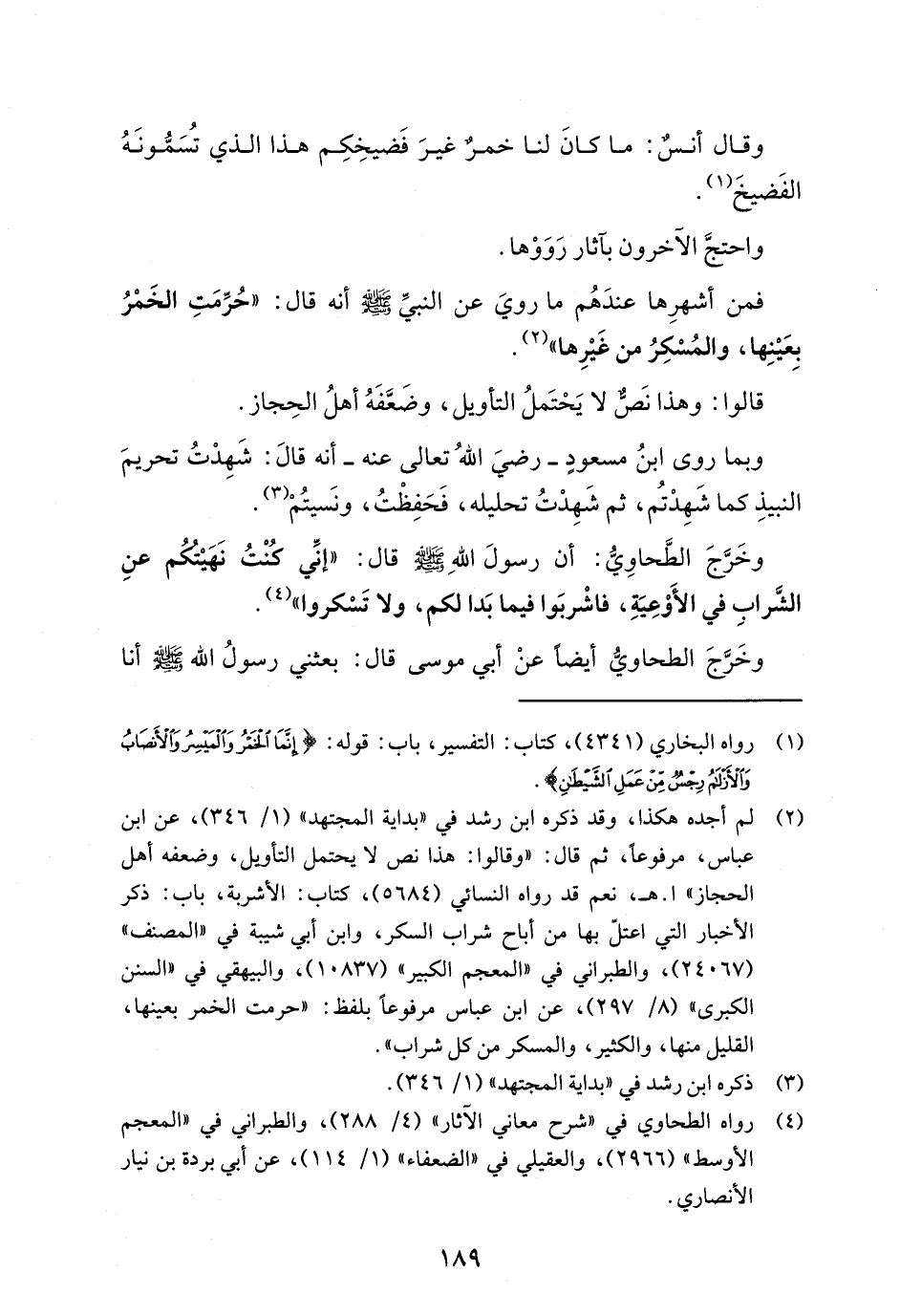 (¬2) لم أجده هكذا، وقد ذكره ابن رشد في "بداية المجتهد" (1/ 346)، عن ابن عباس، مرفوعاً، ثم قال: "وقالوا: هذا نص لا يحتمل التأويل، وضعفه أهل الحجاز" ا. هـ، نعم قد رواه النسائي (5684)، كتاب: الأشربة، باب: ذكر الأخبار التي اعتلّ بها من أباح شراب السكر، وابن أبي شيبة في "المصنف" (24067)، والطبراني في "المعجم الكبير" (10837)، والبيهقي في "السنن الكبرى" (8/ 297)، عن ابن عباس مرفوعاً بلفظ: "حرمت الخمر بعينها، القليل منها، والكثير، والمسكر من كل شراب".