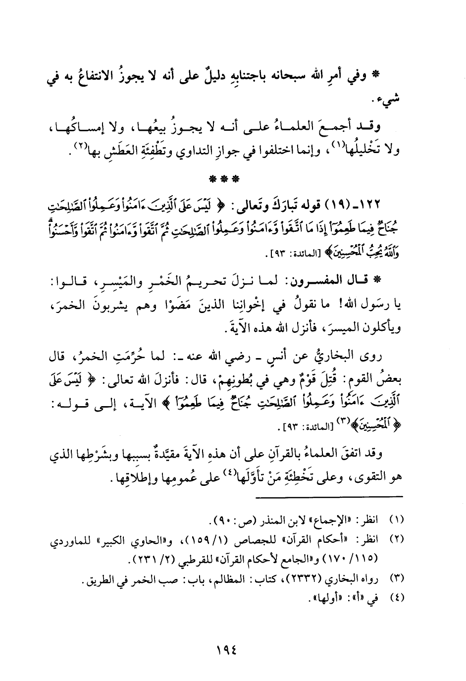 122 - (19) قوله تَبارَكَ وتَعالى: {لَيْسَ عَلَى الَّذِينَ آمَنُوا وَعَمِلُوا الصَّالِحَاتِ جُنَاحٌ فِيمَا طَعِمُوا إِذَا مَا اتَّقَوْا وَآمَنُوا وَعَمِلُوا الصَّالِحَاتِ ثُمَّ اتَّقَوْا وَآمَنُوا ثُمَّ اتَّقَوْا وَأَحْسَنُوا وَاللَّهُ يُحِبُّ الْمُحْسِنِينَ} [المائدة: 93].