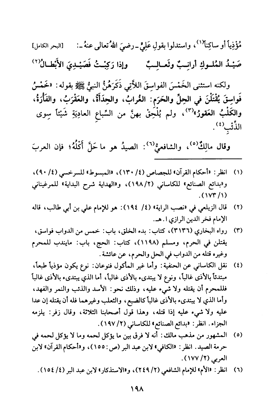 (¬4) نقل الكاساني عن الحنفية: وأما غير المأكول فنوعان: نوع يكون مؤذياً طبعاً، مبتدئاً بالأذى غالباً، ونوع لا يبتدئ بالأذى غالباً، أما الذي يبتدئ بالأذى غالباً فللمحرم أن يقتله ولا شيء عليه، وذلك نحو: الأسد والذئب والنمر والفهد، وأما الذي لا يبتدئ بالأذى غالبًا كالضبع، والثعلب وغيرهما فله أن يقتله إن عدا عليه ولا شيء عليه إذا قتله، وهذا قول أصحابنا الثلاثة، وقال زفر: يلزمه الجزاء. انظر: "بدائع الصنائع" للكاساني (2/ 197).