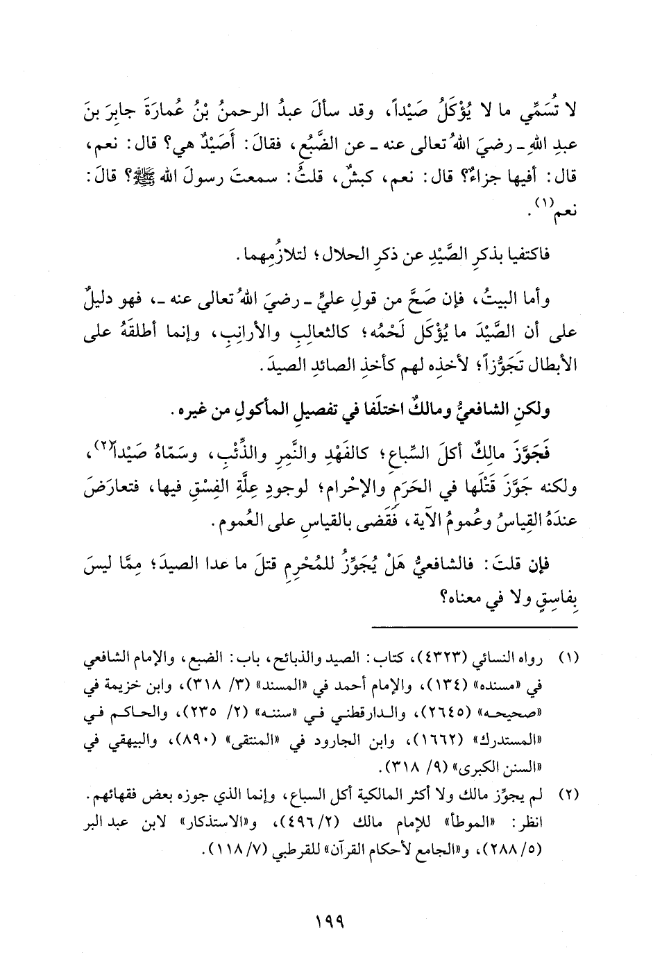 لا تُسَمِّي ما لا يُؤْكَلُ صَيْداً، وقد سألَ عبدُ الرحمنُ بْنُ عُمارَةَ جابِرَ بنَ عبدِ اللهِ -رضيَ اللهُ تعالى عنه- عن الضَّبُعِ، فقالَ: أَصَيْدٌ هي؟ قال: نعم، قال: أفيها جزاءٌ؟ قال: نعم، كبشٌ، قلتُ: سمعتَ رسولَ الله - صلى الله عليه وسلم -؟ قالَ: نعم (¬1).