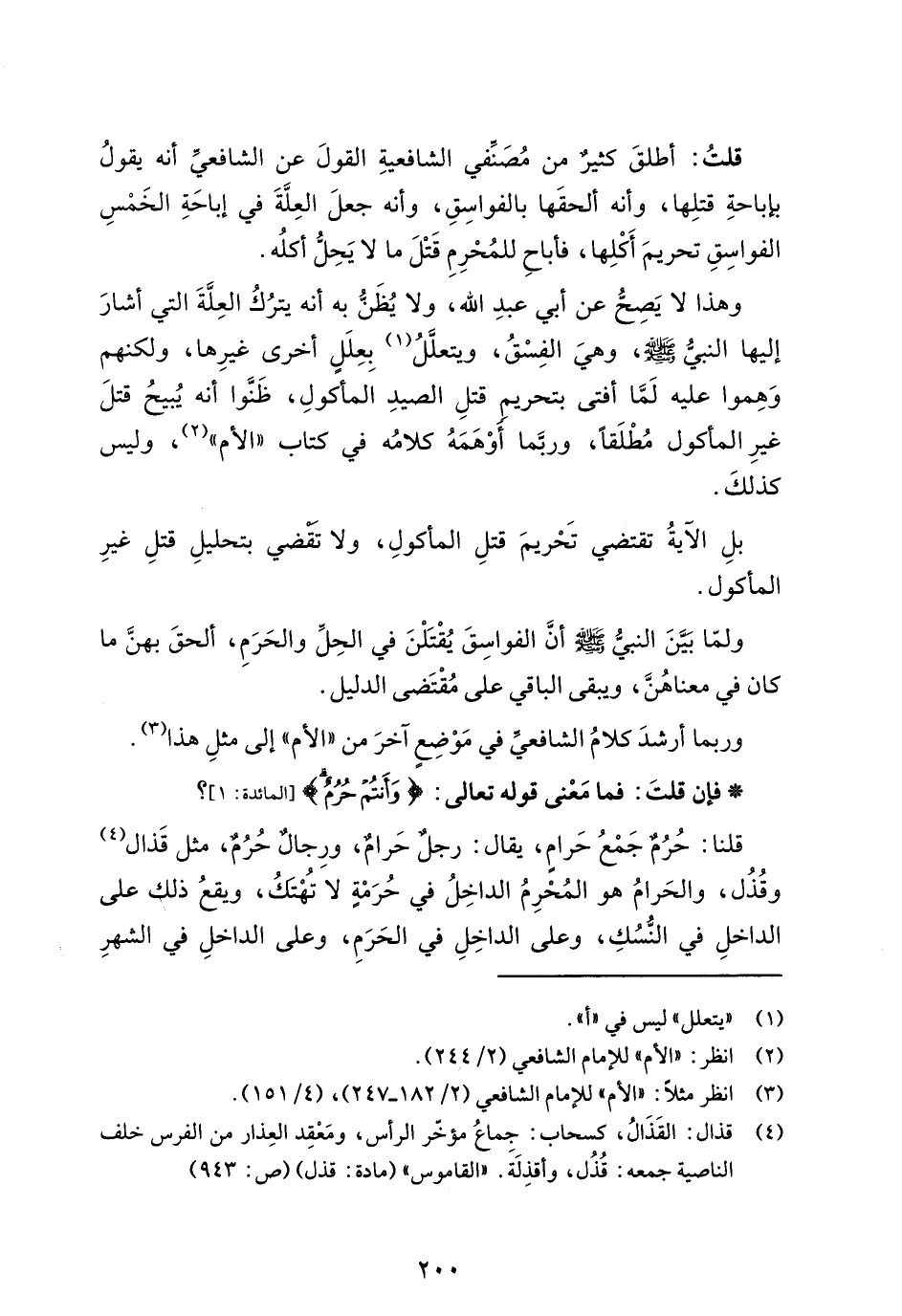 وهذا لا يَصحُّ عن أبي عبدِ الله، ولا يُظَنُّ به أنه يترُكُ العِلَّةَ التي أشارَ إليها النبي - صلى الله عليه وسلم -، وهيَ الفِسْقُ، ويتعلَّلُ (¬1) بِعِلَلٍ أخرى غيرِها، ولكنهم وَهِموا عليه لَمَّا أفتى بتحريم قتلِ الصيدِ المأكولِ، ظَنَّوا أنه يُبيحُ قتلَ غيرِ المأكول مُطْلَقاً، وربّما أوْهمَهُ كلامُه في كتاب "الأم" (¬2)، وليس كذلكَ.