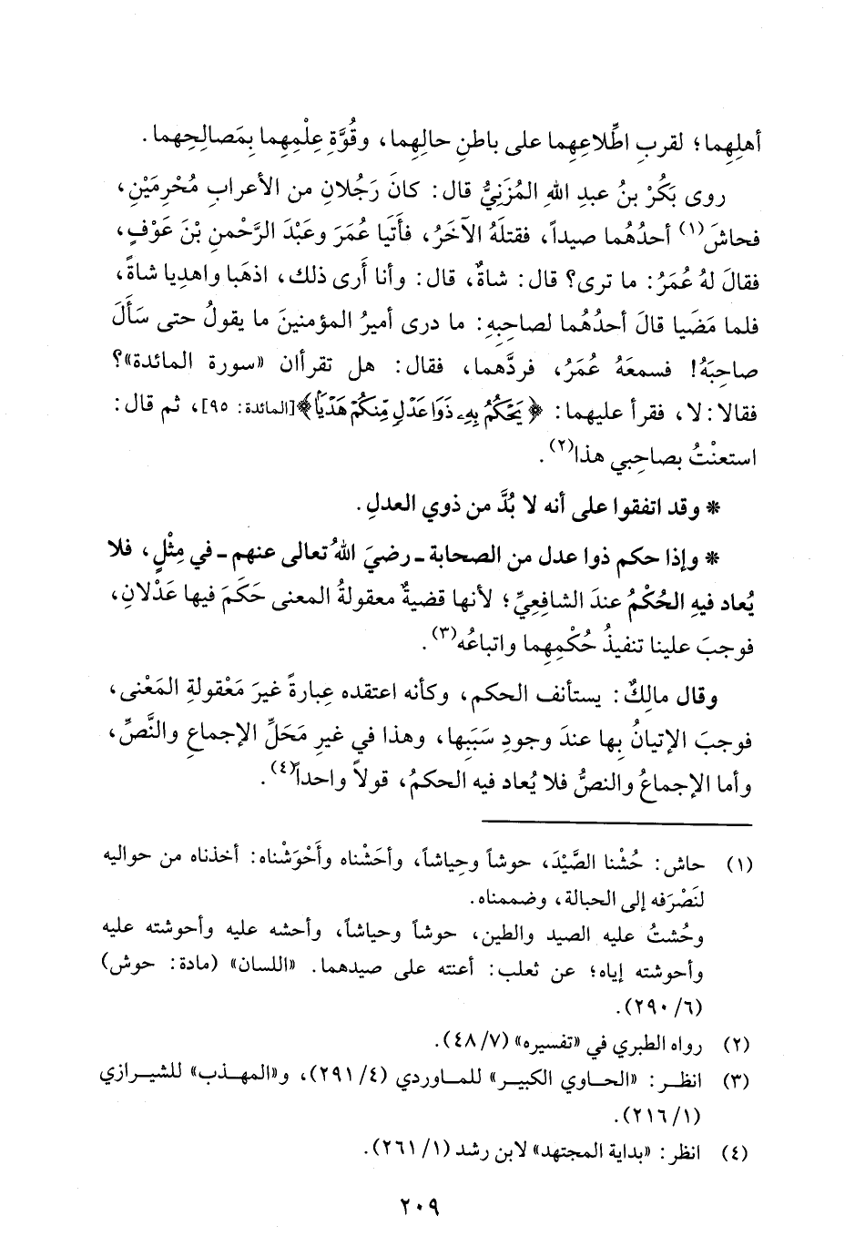 روى بَكُرْ بنُ عبدِ اللهِ المُزنيُّ قال: كانَ رَجُلانِ من الأعرابِ مُحرِمَيْنِ، فحاشَ (¬1) أحدُهُما صيداً، فقتلَهُ الآخَرُ، فأَتيَا عُمَرَ وعَبْدَ الرَّحْمنِ بْنَ عَوْفٍ، فقالَ لهُ عُمَرُ: ما ترى؟ قال: شاةٌ، قال: وأنا أَرى ذلك، اذهبا واهدِيا شاةً، فلما مَضَيا قالَ أحدُهُما لصاحِبهِ: ما درى أميرُ المؤمنينَ ما يقولُ حتى سَأَلَ صاحِبَهُ! فسمعَهُ عُمَرُ، فردّهما، فقال: هل تقرأان "سورة المائدة"؟ فقالا: لا، فقرأ عليهما: {يَحْكُمُ بِهِ ذَوَا عَدْلٍ مِنْكُمْ هَدْيًا} [المائدة: 95]، ثم قال: استعنْتُ بصاحِبي هذا (¬2).