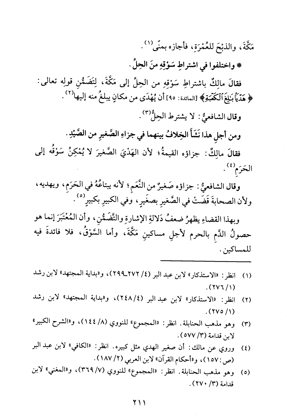 فقالَ مالِكٌ باشتراطِ سَوْقِهِ من الحِلِّ إلى مَكَّةَ، لِتَضَمُّنِ قوله تعالى: {هَدْيًا بَالِغَ الْكَعْبَةِ} [المائدة: 95] أن يُهْدَى من مكانٍ يبلغُ منه إليها (¬2).