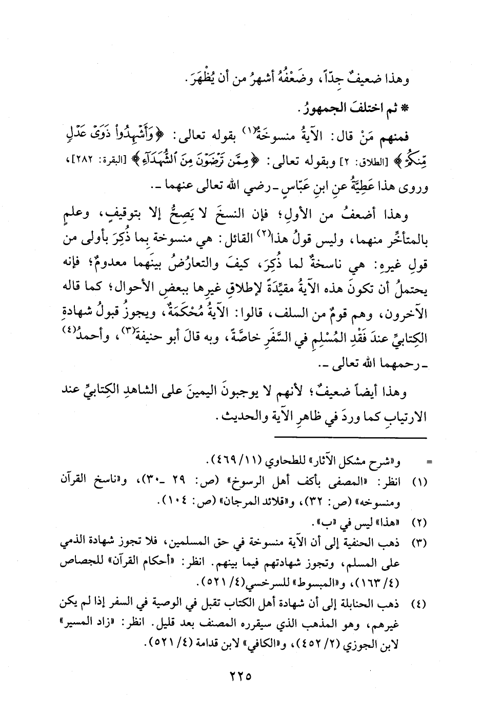 (¬4) ذهب الحنابلة إلى أن شهادة أهل الكتاب تقبل في الوصية في السفر إذا لم يكن غيرهم، وهو المذهب الذي سيقرره المصنف بعد قليل. انظر: "زاد المسير" لابن الجوزي (2/ 452)، و"الكافي" لابن قدامة (4/ 521).