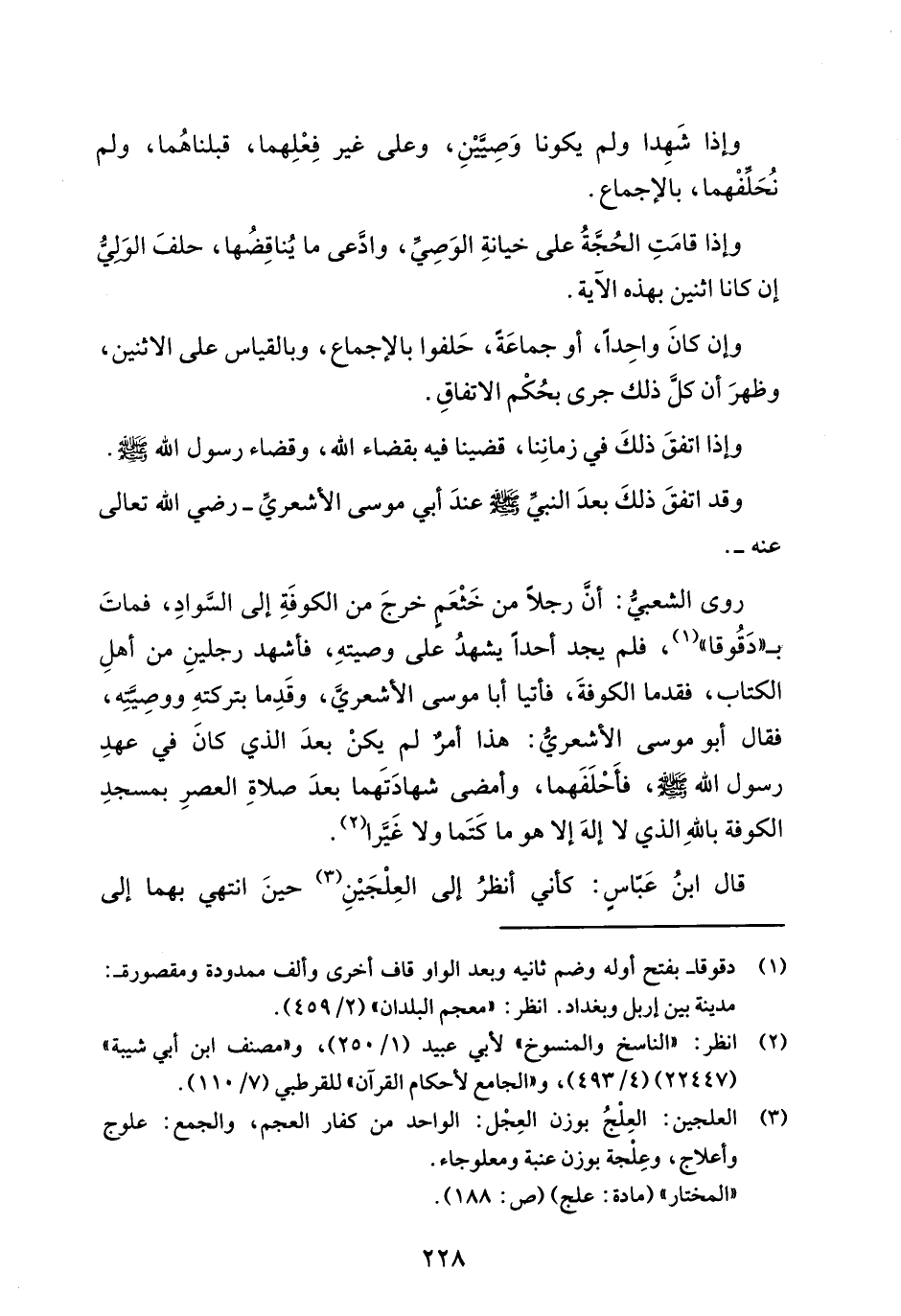 روى الشعبيُّ: أنَّ رجلاً من خَثْعَمٍ خرجَ من الكوفَةِ إلى السَّوادِ، فماتَ بـ "دَقُوقا" (¬1)، فلم يجد أحداً يشهدُ على وصيتهِ، فأشهد رجلينِ من أهلِ الكتاب، فقدما الكوفةَ، فأتيا أبا موسى الأشعريُّ، وقَدِما بتركتهِ ووصِيَّتِه، فقال أبو موسى الأشعريُّ: هذا أمرٌ لم يكنْ بعدَ الذي كانَ في عهدِ رسول الله - صلى الله عليه وسلم -، فأَحْلَفَهما، وأمضى شهادَتَهما بعدَ صلاةِ العصرِ بمسجدِ الكوفة باللهِ الذي لا إلهَ إلا هو ما كَتَما ولا غَيَّرا (¬2).