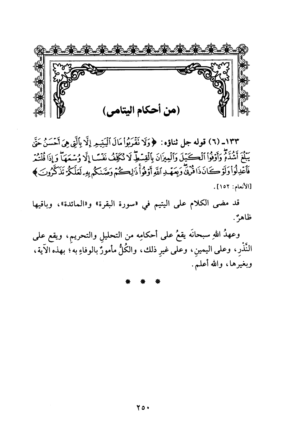 133 - (6) قوله جل ثناؤه: {وَلَا تَقْرَبُوا مَالَ الْيَتِيمِ إِلَّا بِالَّتِي هِيَ أَحْسَنُ حَتَّى يَبْلُغَ أَشُدَّهُ وَأَوْفُوا الْكَيْلَ وَالْمِيزَانَ بِالْقِسْطِ لَا نُكَلِّفُ نَفْسًا إِلَّا وُسْعَهَا وَإِذَا قُلْتُمْ فَاعْدِلُوا وَلَوْ كَانَ ذَا قُرْبَى وَبِعَهْدِ اللَّهِ أَوْفُوا ذَلِكُمْ وَصَّاكُمْ بِهِ لَعَلَّكُمْ تَذَكَّرُونَ} [الأنعام: 152].
