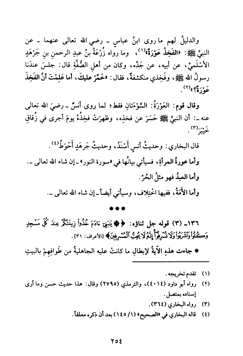 136 - (3) قوله جل ثناؤه: {يَابَنِي آدَمَ خُذُوا زِينَتَكُمْ عِنْدَ كُلِّ مَسْجِدٍ وَكُلُوا وَاشْرَبُوا وَلَا تُسْرِفُوا إِنَّهُ لَا يُحِبُّ الْمُسْرِفِينَ} [الأعراف: 31].