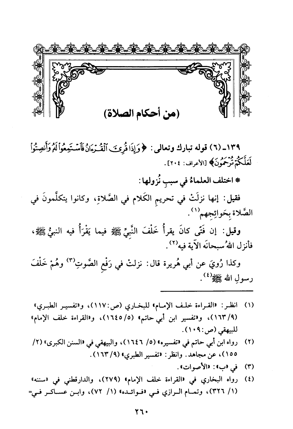 139 - (6) قوله تبارك وتعالى: {وَإِذَا قُرِئَ الْقُرْآنُ فَاسْتَمِعُوا لَهُ وَأَنْصِتُوا لَعَلَّكُمْ تُرْحَمُونَ} [الأعراف: 204].