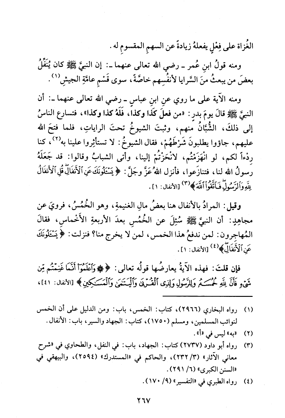 ومنه قولُ ابنِ عُمر -رضي الله تعالى عنهما-: إن النبيَّ - صلى الله عليه وسلم - كان يُنَفِّلُ بعضَ من يبعثُ منَ السَّرايا لأنفُسِهم خاصَّةً، سوى قَسْمِ عامَّةِ الجيشِ (¬1).