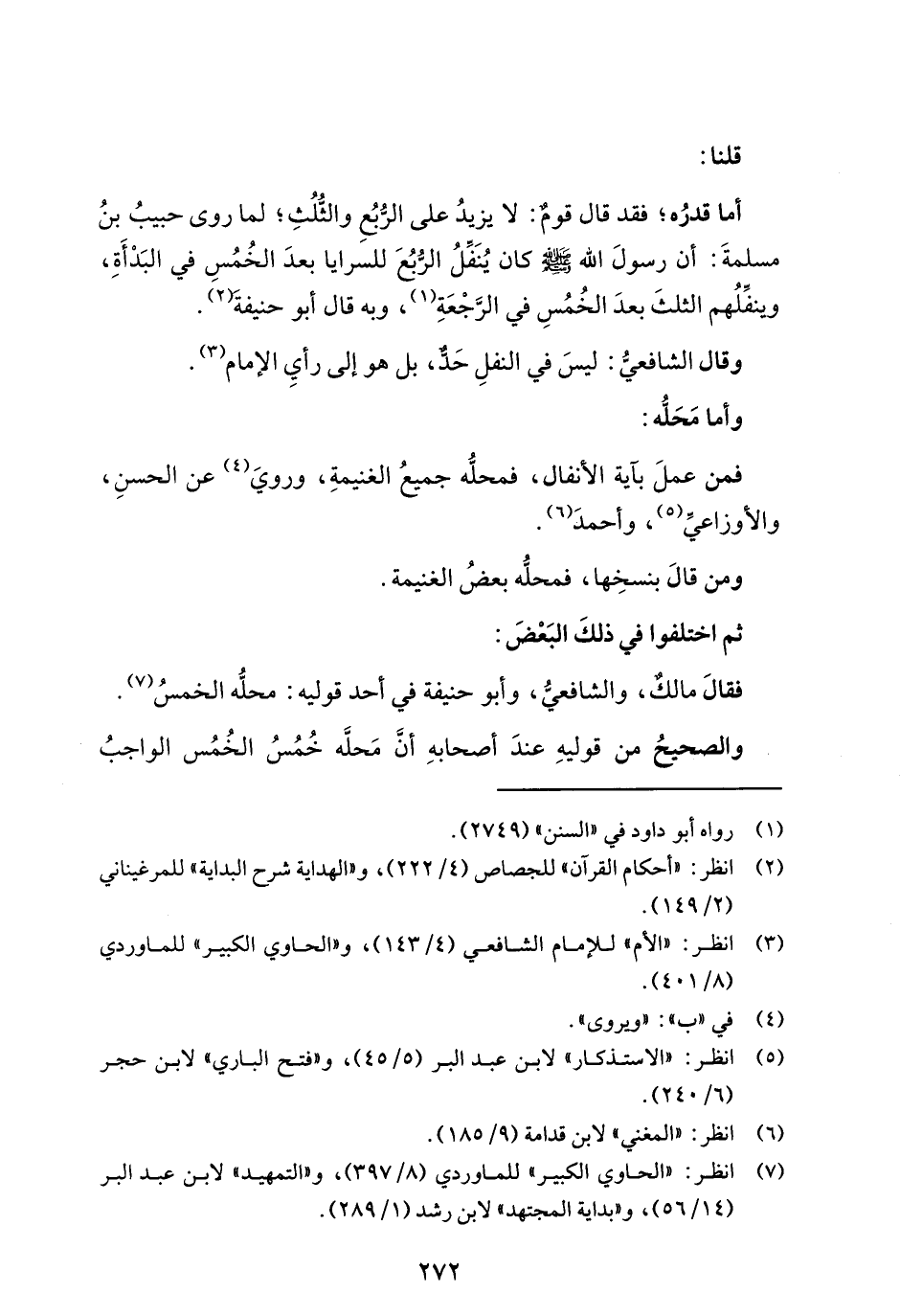 أما قدرُه؛ فقد قال قومٌ: لا يزيدُ على الرُّبُعِ والثُّلُثِ؛ لما روى حبيبُ بنُ مسلمةَ: أن رسولَ الله - صلى الله عليه وسلم - كان يُنَفِّلُ الرُّبُعَ للسرايا بعدَ الخُمُسِ في البَدْأَةِ، وينفِّلُهم الثلثَ بعدَ الخُمُسِ في الرِّجْعَةِ (¬1)، وبه قال أبو حنيفةَ (¬2).
