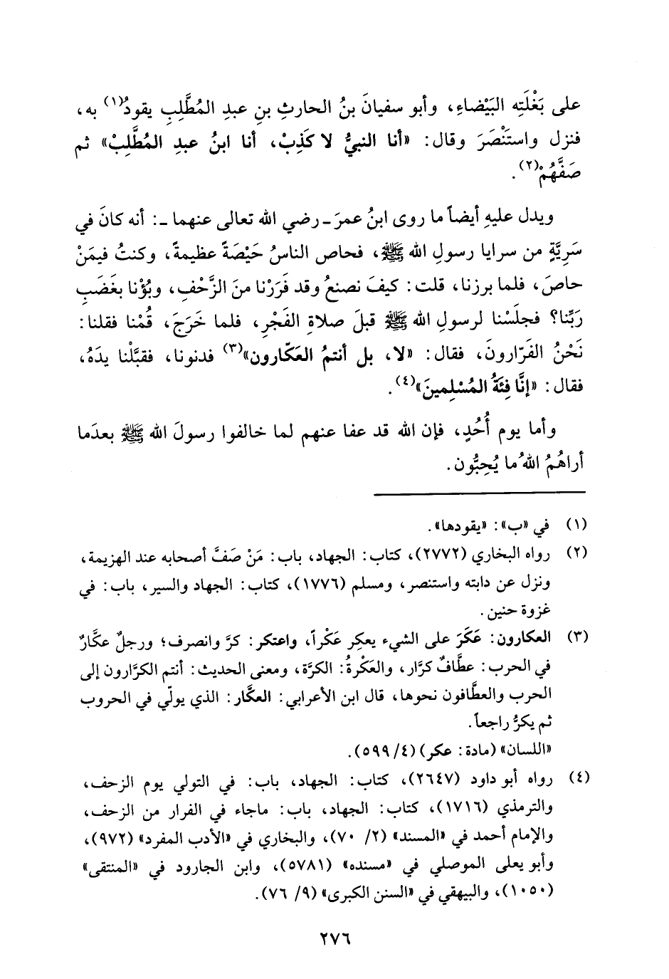 ويدل عليهِ أيضاً ما روى ابنُ عمرَ -رضي الله تعالى عنهما-: أنه كانَ في سَرِيَّةٍ من سرايا رسولِ الله - صلى الله عليه وسلم -، فحاص الناسُ حَيْصَةً عظيمةً، وكنتُ فيمَنْ حاصَ، فلما برزنا، قلت: كيفَ نصنعُ وقد فَرَرْنا منَ الزَّحْفِ، وبُؤْنا بغَضَبِ رَبِّنا؟ فجلَسْنا لرسولِ الله - صلى الله عليه وسلم - قبلَ صلاةِ الفَجْرِ، فلما خَرَجَ، قُمْنا فقلنا: نَحْنُ الفَرّارونَ، فقال: "لا، بل أنتمُ العَكّارون" (¬3) فدنونا، فقبَّلْنا يدَهُ، فقال: "إنَّا فِئَةُ المُسْلِمينَ" (¬4).