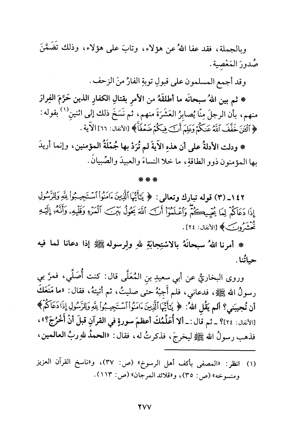 142 - (3) قوله تبارك وتعالى: {يَاأَيُّهَا الَّذِينَ آمَنُوا اسْتَجِيبُوا لِلَّهِ وَلِلرَّسُولِ إِذَا دَعَاكُمْ لِمَا يُحْيِيكُمْ وَاعْلَمُوا أَنَّ اللَّهَ يَحُولُ بَيْنَ الْمَرْءِ وَقَلْبِهِ وَأَنَّهُ إِلَيْهِ تُحْشَرُونَ} [الأنفال: 24].