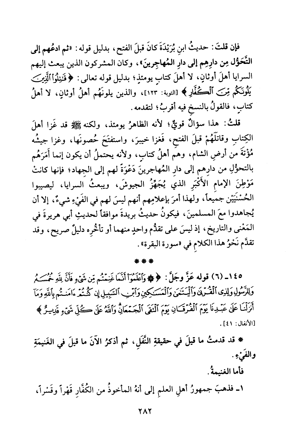 145 - (6) قوله عَز وجَل: {وَاعْلَمُوا أَنَّمَا غَنِمْتُمْ مِنْ شَيْءٍ فَأَنَّ لِلَّهِ خُمُسَهُ وَلِلرَّسُولِ وَلِذِي الْقُرْبَى وَالْيَتَامَى وَالْمَسَاكِينِ وَابْنِ السَّبِيلِ إِنْ كُنْتُمْ آمَنْتُمْ بِاللَّهِ وَمَا أَنْزَلْنَا عَلَى عَبْدِنَا يَوْمَ الْفُرْقَانِ يَوْمَ الْتَقَى الْجَمْعَانِ وَاللَّهُ عَلَى كُلِّ شَيْءٍ قَدِيرٌ} [الأنفال: 41].