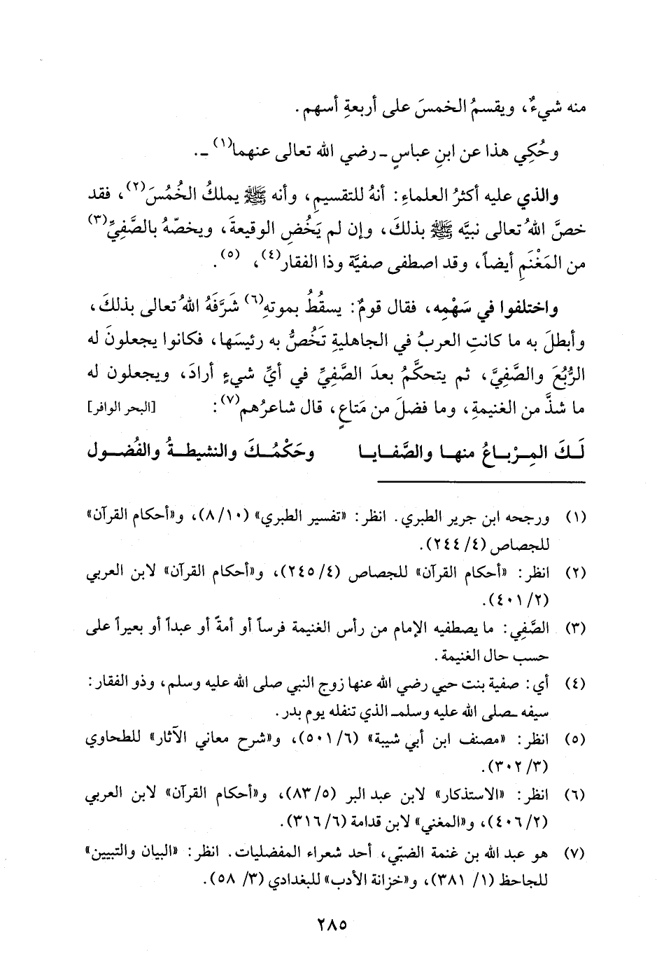 واختلفوا في سَهْمِه، فقال قومٌ: يسقُطُ بموتهِ (¬6) شَرَّفَهُ اللهُ تعالى بذلكَ، وأبطلَ به ما كانتِ العربُ في الجاهليةِ تَخُصُّ به رئيسَها، فكانوا يجعلونَ له الرُّبُعَ والصَّفِيَّ، ثم يتحكَّمُ بعدَ الصَّفِيِّ في أيِّ شي؛ أرادَ، ويجعلون له ما شذَّ من الغنيمةِ، وما فضلَ من مَتاعٍ، قال شاعرُهم (¬7): [البحر الوافر]